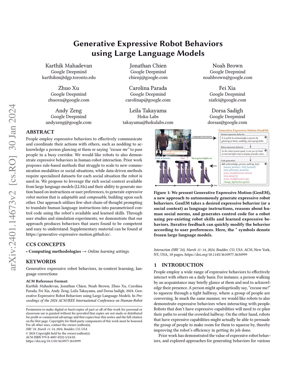 People employ expressive behaviors to effectively communicate and coordinate their actions with others, such as nodding to acknowledge a person glancing at them or saying "excuse me" to pass people in a busy corridor. We would like robots to also demonstrate expressive behaviors in human-robot interaction. Prior work proposes rule-based methods that struggle to scale to new communication modalities or social situations, while data-driven methods require specialized datasets for each social situation the robot is used in. We propose to leverage the rich social context available from large language models (LLMs) and their ability to generate motion based on instructions or user preferences, to generate expressive robot motion that is adaptable and composable, building upon each other. Our approach utilizes few-shot chain-of-thought prompting to translate human language instructions into parametrized control code using the robot's available and learned skills. Through user studies and simulation experiments, we demonstrate that our approach produces behaviors that users found to be competent and easy to understand. Supplementary material can be found at https://generative-expressive-motion.github.io/.
