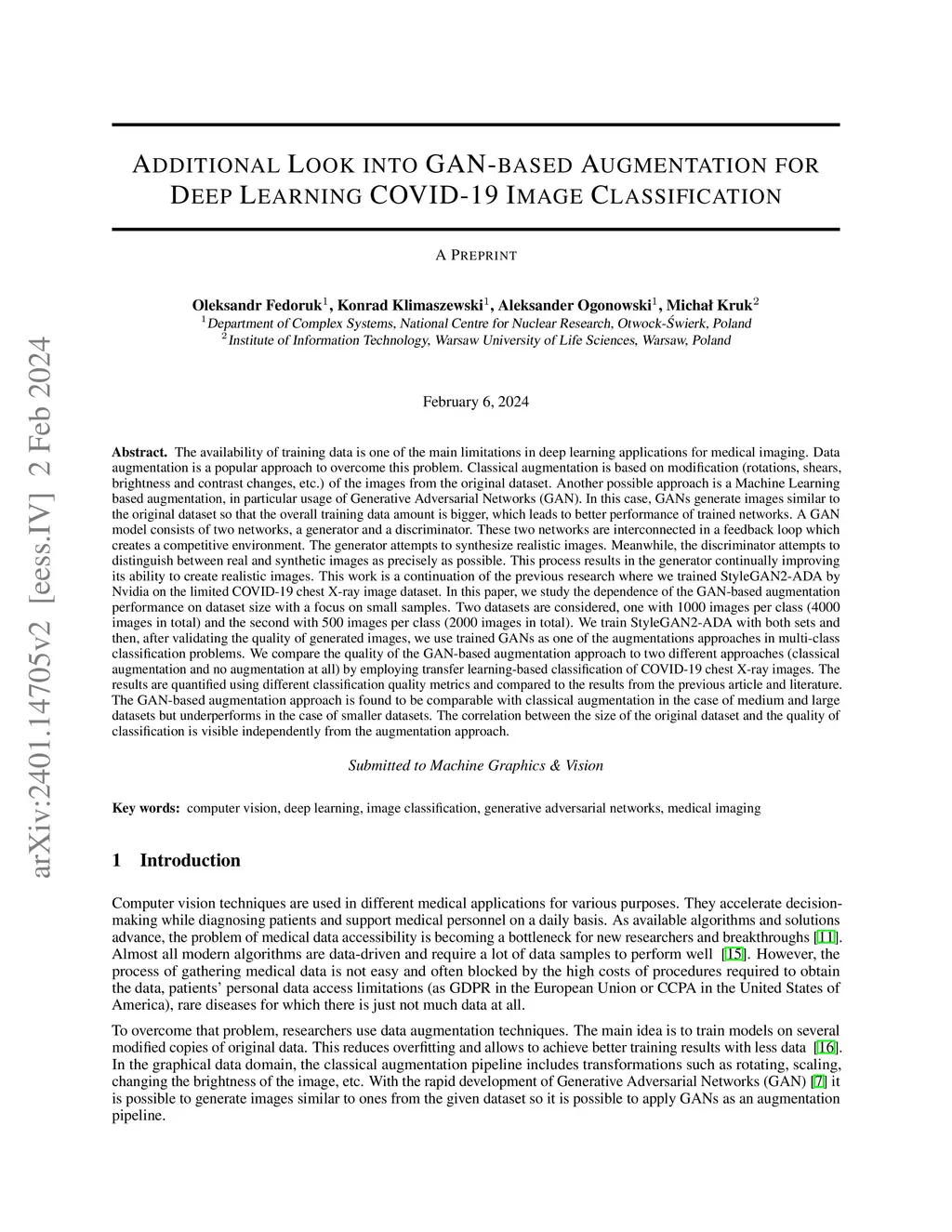 The availability of training data is one of the main limitations in deep learning applications for medical imaging. Data augmentation is a popular approach to overcome this problem. A new approach is a Machine Learning based augmentation, in particular usage of Generative Adversarial Networks (GAN). In this case, GANs generate images similar to the original dataset so that the overall training data amount is bigger, which leads to better performance of trained networks. A GAN model consists of two networks, a generator and a discriminator interconnected in a feedback loop which creates a competitive environment. This work is a continuation of the previous research where we trained StyleGAN2-ADA by Nvidia on the limited COVID-19 chest X-ray image dataset. In this paper, we study the dependence of the GAN-based augmentation performance on dataset size with a focus on small samples. Two datasets are considered, one with 1000 images per class (4000 images in total) and the second with 500 images per class (2000 images in total). We train StyleGAN2-ADA with both sets and then, after validating the quality of generated images, we use trained GANs as one of the augmentations approaches in multi-class classification problems. We compare the quality of the GAN-based augmentation approach to two different approaches (classical augmentation and no augmentation at all) by employing transfer learning-based classification of COVID-19 chest X-ray images. The results are quantified using different classification quality metrics and compared to the results from the literature. The GAN-based augmentation approach is found to be comparable with classical augmentation in the case of medium and large datasets but underperforms in the case of smaller datasets. The correlation between the size of the original dataset and the quality of classification is visible independently from the augmentation approach.