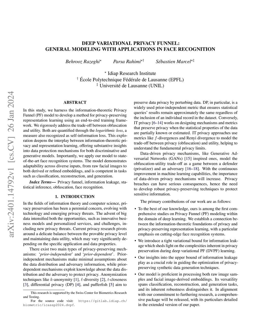 In this study, we harness the information-theoretic Privacy Funnel (PF) model to develop a method for privacy-preserving representation learning using an end-to-end training framework. We rigorously address the trade-off between obfuscation and utility. Both are quantified through the logarithmic loss, a measure also recognized as self-information loss. This exploration deepens the interplay between information-theoretic privacy and representation learning, offering substantive insights into data protection mechanisms for both discriminative and generative models. Importantly, we apply our model to state-of-the-art face recognition systems. The model demonstrates adaptability across diverse inputs, from raw facial images to both derived or refined embeddings, and is competent in tasks such as classification, reconstruction, and generation.