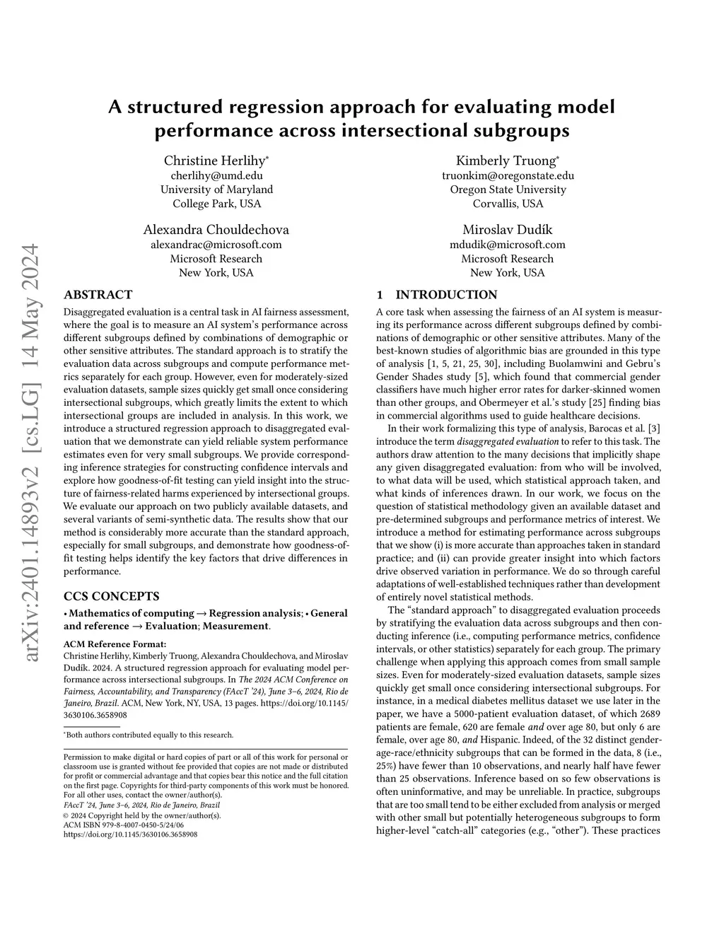 Disaggregated evaluation is a central task in AI fairness assessment, where the goal is to measure an AI system's performance across different subgroups defined by combinations of demographic or other sensitive attributes. The standard approach is to stratify the evaluation data across subgroups and compute performance metrics separately for each group. However, even for moderately-sized evaluation datasets, sample sizes quickly get small once considering intersectional subgroups, which greatly limits the extent to which intersectional groups are included in analysis. In this work, we introduce a structured regression approach to disaggregated evaluation that we demonstrate can yield reliable system performance estimates even for very small subgroups. We provide corresponding inference strategies for constructing confidence intervals and explore how goodness-of-fit testing can yield insight into the structure of fairness-related harms experienced by intersectional groups. We evaluate our approach on two publicly available datasets, and several variants of semi-synthetic data. The results show that our method is considerably more accurate than the standard approach, especially for small subgroups, and demonstrate how goodness-of-fit testing helps identify the key factors that drive differences in performance.