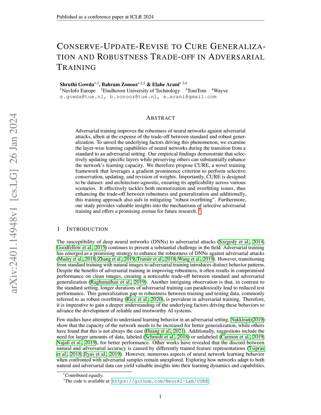 Adversarial training improves the robustness of neural networks against adversarial attacks, albeit at the expense of the trade-off between standard and robust generalization. To unveil the underlying factors driving this phenomenon, we examine the layer-wise learning capabilities of neural networks during the transition from a standard to an adversarial setting. Our empirical findings demonstrate that selectively updating specific layers while preserving others can substantially enhance the network's learning capacity. We therefore propose CURE, a novel training framework that leverages a gradient prominence criterion to perform selective conservation, updating, and revision of weights. Importantly, CURE is designed to be dataset- and architecture-agnostic, ensuring its applicability across various scenarios. It effectively tackles both memorization and overfitting issues, thus enhancing the trade-off between robustness and generalization and additionally, this training approach also aids in mitigating "robust overfitting". Furthermore, our study provides valuable insights into the mechanisms of selective adversarial training and offers a promising avenue for future research.