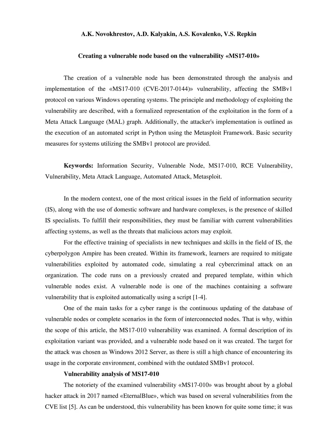 The creation of a vulnerable node has been demonstrated through the analysis and implementation of the MS17-010 (CVE-2017-0144) vulnerability, affecting the SMBv1 protocol on various Windows operating systems. The principle and methodology of exploiting the vulnerability are described, with a formalized representation of the exploitation in the form of a Meta Attack Language (MAL) graph. Additionally, the attacker's implementation is outlined as the execution of an automated script in Python using the Metasploit Framework. Basic security measures for systems utilizing the SMBv1 protocol are provided.