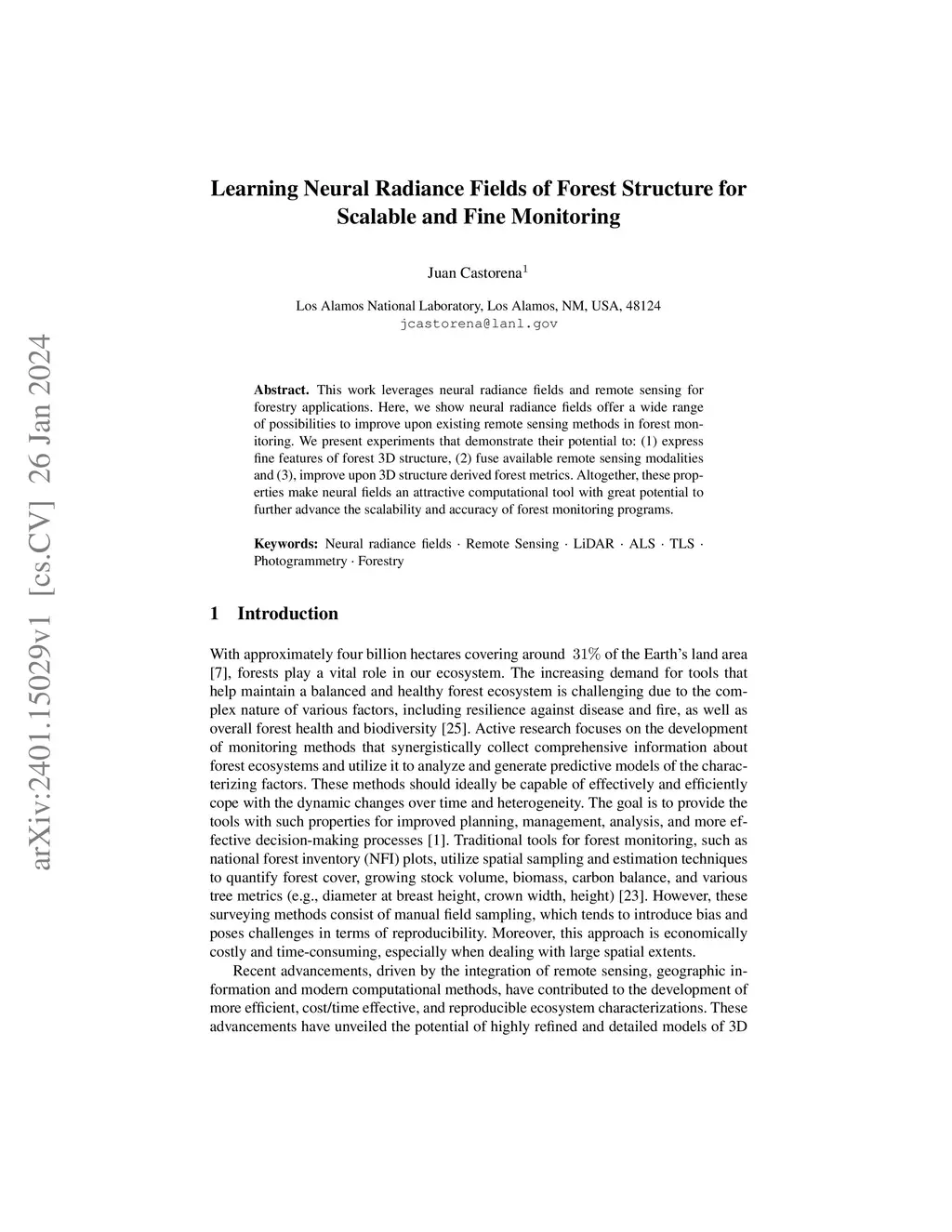 This work leverages neural radiance fields and remote sensing for forestry applications. Here, we show neural radiance fields offer a wide range of possibilities to improve upon existing remote sensing methods in forest monitoring. We present experiments that demonstrate their potential to: (1) express fine features of forest 3D structure, (2) fuse available remote sensing modalities and (3), improve upon 3D structure derived forest metrics. Altogether, these properties make neural fields an attractive computational tool with great potential to further advance the scalability and accuracy of forest monitoring programs.