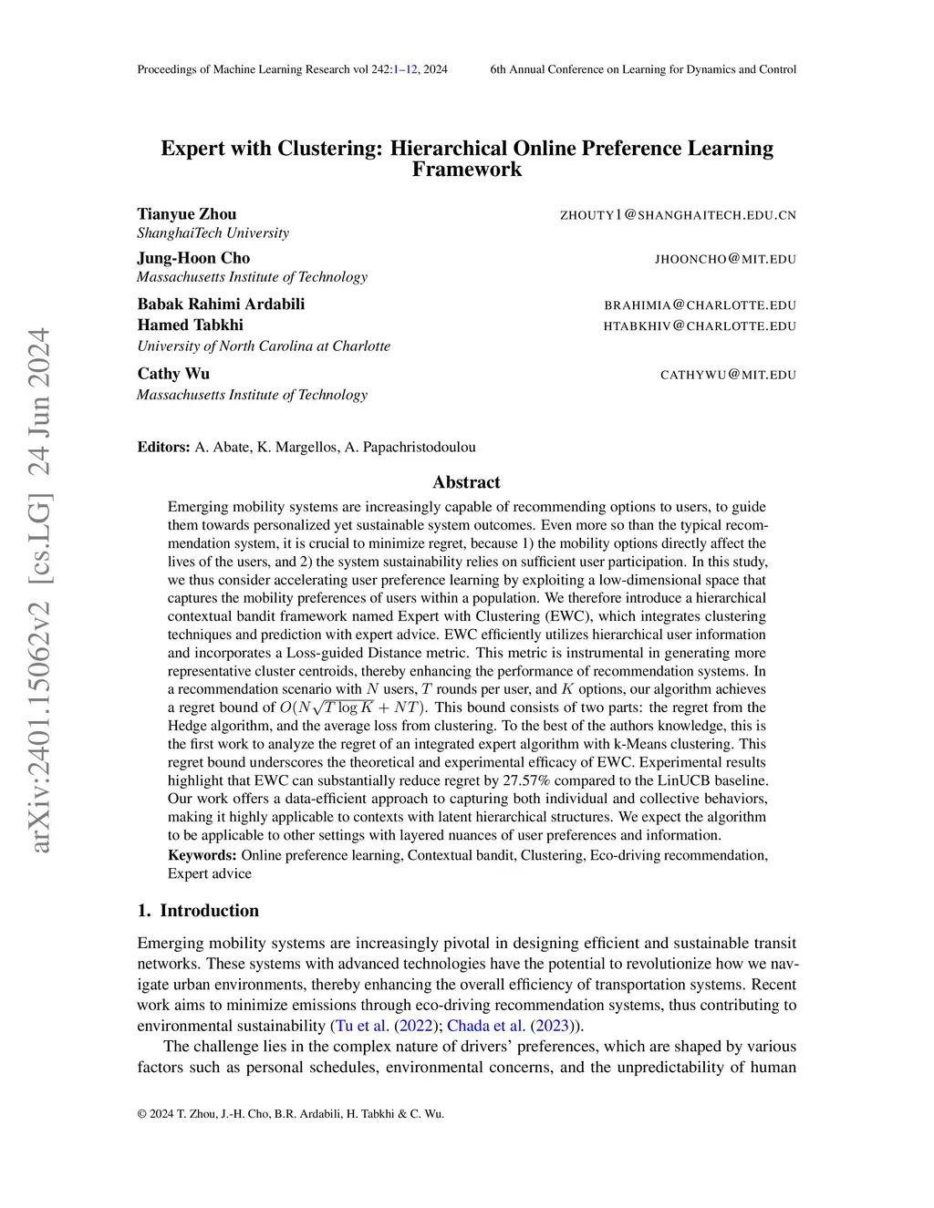 Emerging mobility systems are increasingly capable of recommending options to mobility users, to guide them towards personalized yet sustainable system outcomes. Even more so than the typical recommendation system, it is crucial to minimize regret, because 1) the mobility options directly affect the lives of the users, and 2) the system sustainability relies on sufficient user participation. In this study, we consider accelerating user preference learning by exploiting a low-dimensional latent space that captures the mobility preferences of users. We introduce a hierarchical contextual bandit framework named Expert with Clustering (EWC), which integrates clustering techniques and prediction with expert advice. EWC efficiently utilizes hierarchical user information and incorporates a novel Loss-guided Distance metric. This metric is instrumental in generating more representative cluster centroids. In a recommendation scenario with users, rounds per user, and options, our algorithm achieves a regret bound of . This bound consists of two parts: the first term is the regret from the Hedge algorithm, and the second term depends on the average loss from clustering. To the best of the authors knowledge, this is the first work to analyze the regret of an integrated expert algorithm with k-Means clustering. This regret bound underscores the theoretical and experimental efficacy of EWC, particularly in scenarios that demand rapid learning and adaptation. Experimental results highlight that EWC can substantially reduce regret by 27.57% compared to the LinUCB baseline. Our work offers a data-efficient approach to capturing both individual and collective behaviors, making it highly applicable to contexts with hierarchical structures. We expect the algorithm to be applicable to other settings with layered nuances of user preferences and information.