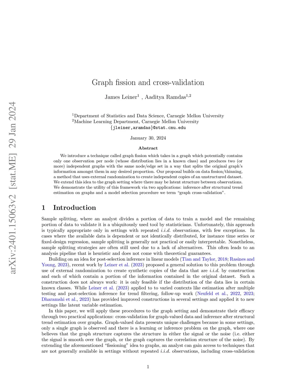 We introduce a technique called graph fission which takes in a graph which potentially contains only one observation per node (whose distribution lies in a known class) and produces two (or more) independent graphs with the same node/edge set in a way that splits the original graph's information amongst them in any desired proportion. Our proposal builds on data fission/thinning, a method that uses external randomization to create independent copies of an unstructured dataset. We extend this idea to the graph setting where there may be latent structure between observations. We demonstrate the utility of this framework via two applications: inference after structural trend estimation on graphs and a model selection procedure we term "graph cross-validation".