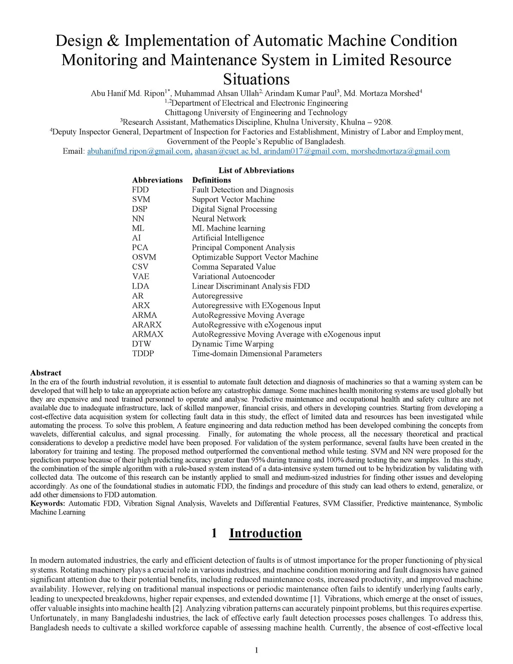 In the era of the fourth industrial revolution, it is essential to automate fault detection and diagnosis of machineries so that a warning system can be developed that will help to take an appropriate action before any catastrophic damage. Some machines health monitoring systems are used globally but they are expensive and need trained personnel to operate and analyse. Predictive maintenance and occupational health and safety culture are not available due to inadequate infrastructure, lack of skilled manpower, financial crisis, and others in developing countries. Starting from developing a cost-effective DAS for collecting fault data in this study, the effect of limited data and resources has been investigated while automating the process. To solve this problem, A feature engineering and data reduction method has been developed combining the concepts from wavelets, differential calculus, and signal processing. Finally, for automating the whole process, all the necessary theoretical and practical considerations to develop a predictive model have been proposed. The DAS successfully collected the required data from the machine that is 89% accurate compared to the professional manual monitoring system. SVM and NN were proposed for the prediction purpose because of their high predicting accuracy greater than 95% during training and 100% during testing the new samples. In this study, the combination of the simple algorithm with a rule-based system instead of a data-intensive system turned out to be hybridization by validating with collected data. The outcome of this research can be instantly applied to small and medium-sized industries for finding other issues and developing accordingly. As one of the foundational studies in automatic FDD, the findings and procedure of this study can lead others to extend, generalize, or add other dimensions to FDD automation.