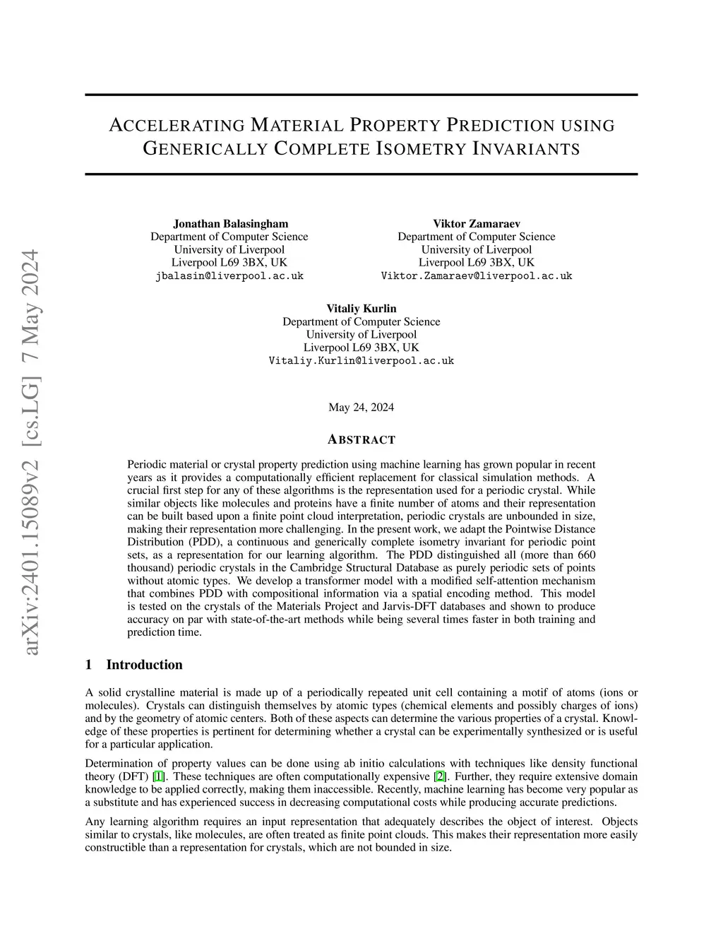 Periodic material or crystal property prediction using machine learning has grown popular in recent years as it provides a computationally efficient replacement for classical simulation methods. A crucial first step for any of these algorithms is the representation used for a periodic crystal. While similar objects like molecules and proteins have a finite number of atoms and their representation can be built based upon a finite point cloud interpretation, periodic crystals are unbounded in size, making their representation more challenging. In the present work, we adapt the Pointwise Distance Distribution (PDD), a continuous and generically complete isometry invariant for periodic point sets, as a representation for our learning algorithm. The PDD distinguished all (more than 660 thousand) periodic crystals in the Cambridge Structural Database as purely periodic sets of points without atomic types. We develop a transformer model with a modified self-attention mechanism that combines PDD with compositional information via a spatial encoding method. This model is tested on the crystals of the Materials Project and Jarvis-DFT databases and shown to produce accuracy on par with state-of-the-art methods while being several times faster in both training and prediction time.