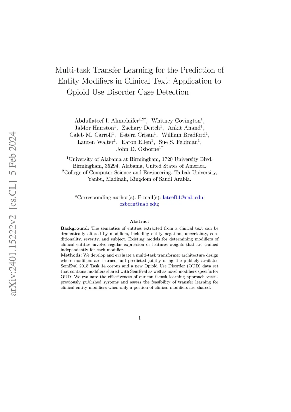 Background: The semantics of entities extracted from a clinical text can be dramatically altered by modifiers, including entity negation, uncertainty, conditionality, severity, and subject. Existing models for determining modifiers of clinical entities involve regular expression or features weights that are trained independently for each modifier. Methods: We develop and evaluate a multi-task transformer architecture design where modifiers are learned and predicted jointly using the publicly available SemEval 2015 Task 14 corpus and a new Opioid Use Disorder (OUD) data set that contains modifiers shared with SemEval as well as novel modifiers specific for OUD. We evaluate the effectiveness of our multi-task learning approach versus previously published systems and assess the feasibility of transfer learning for clinical entity modifiers when only a portion of clinical modifiers are shared. Results: Our approach achieved state-of-the-art results on the ShARe corpus from SemEval 2015 Task 14, showing an increase of 1.1% on weighted accuracy, 1.7% on unweighted accuracy, and 10% on micro F1 scores. Conclusions: We show that learned weights from our shared model can be effectively transferred to a new partially matched data set, validating the use of transfer learning for clinical text modifiers