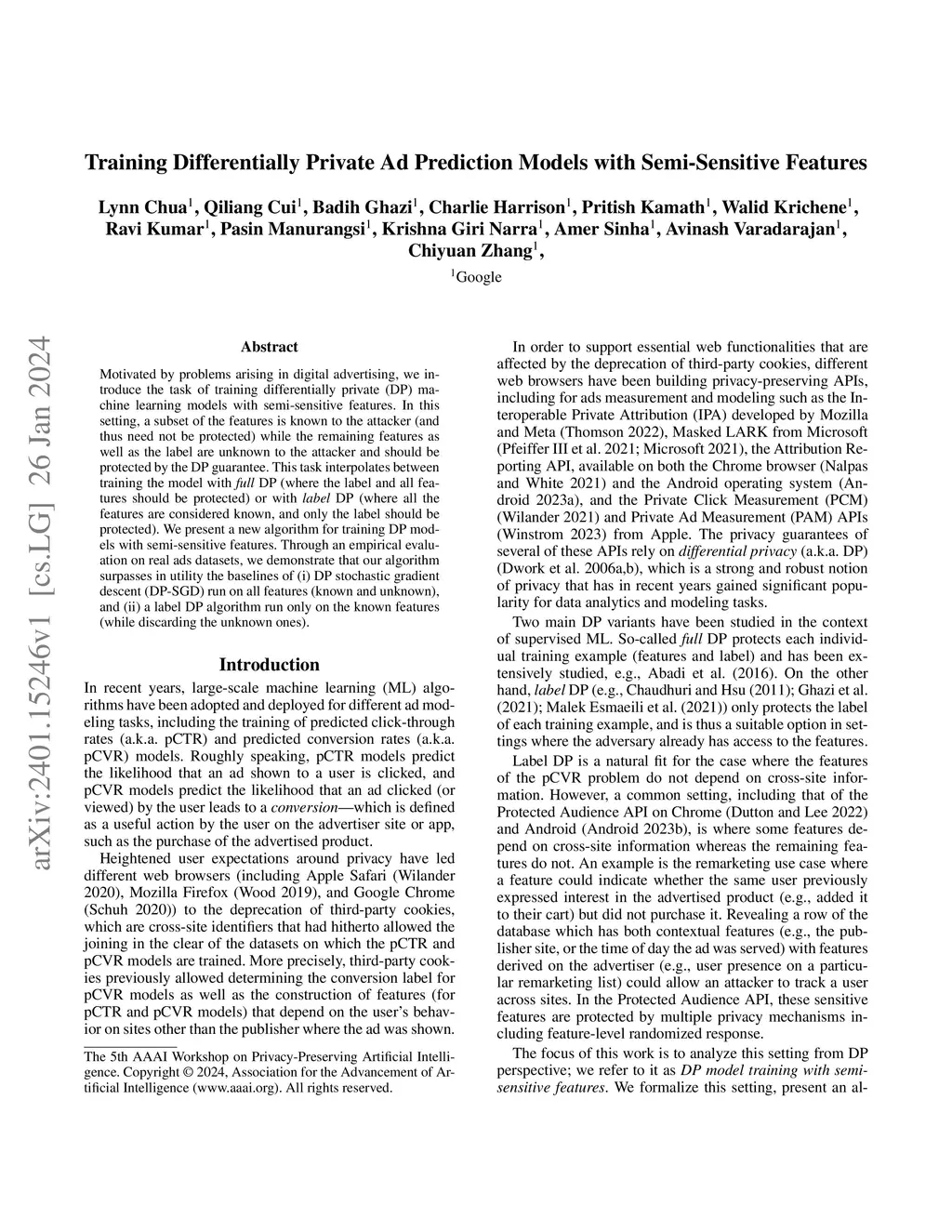 Training Differentially Private Ad Prediction Models with Semi-Sensitive