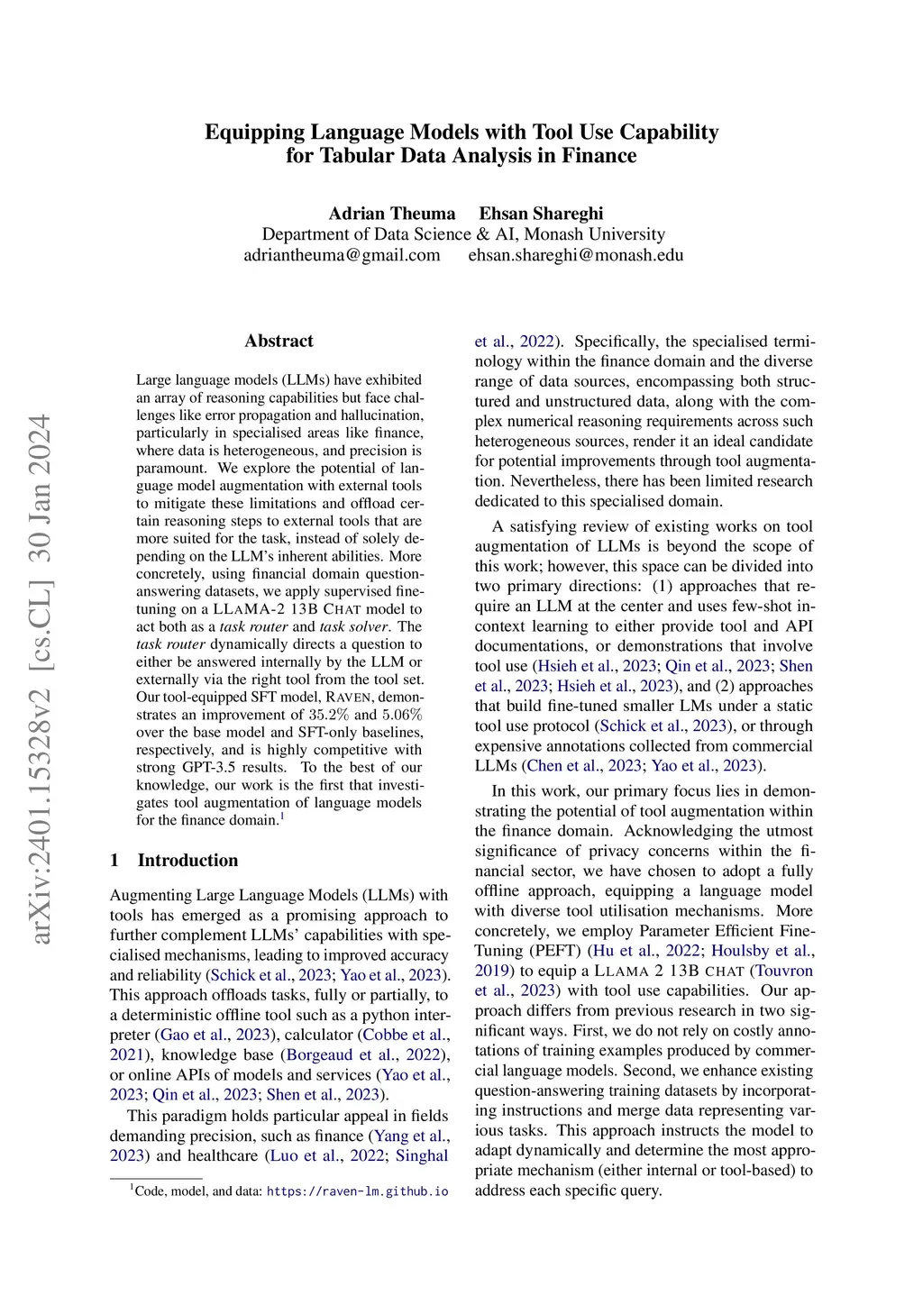 Large language models (LLMs) have exhibited an array of reasoning capabilities but face challenges like error propagation and hallucination, particularly in specialised areas like finance, where data is heterogeneous, and precision is paramount. We explore the potential of language model augmentation with external tools to mitigate these limitations and offload certain reasoning steps to external tools that are more suited for the task, instead of solely depending on the LLM's inherent abilities. More concretely, using financial domain question-answering datasets, we apply supervised fine-tuning on a LLaMA-2 13B Chat model to act both as a 'task router' and 'task solver'. The 'task router' dynamically directs a question to either be answered internally by the LLM or externally via the right tool from the tool set. Our tool-equipped SFT model, Raven, demonstrates an improvement of 35.2% and 5.06% over the base model and SFT-only baselines, respectively, and is highly competitive with strong GPT-3.5 results. To the best of our knowledge, our work is the first that investigates tool augmentation of language models for the finance domain.