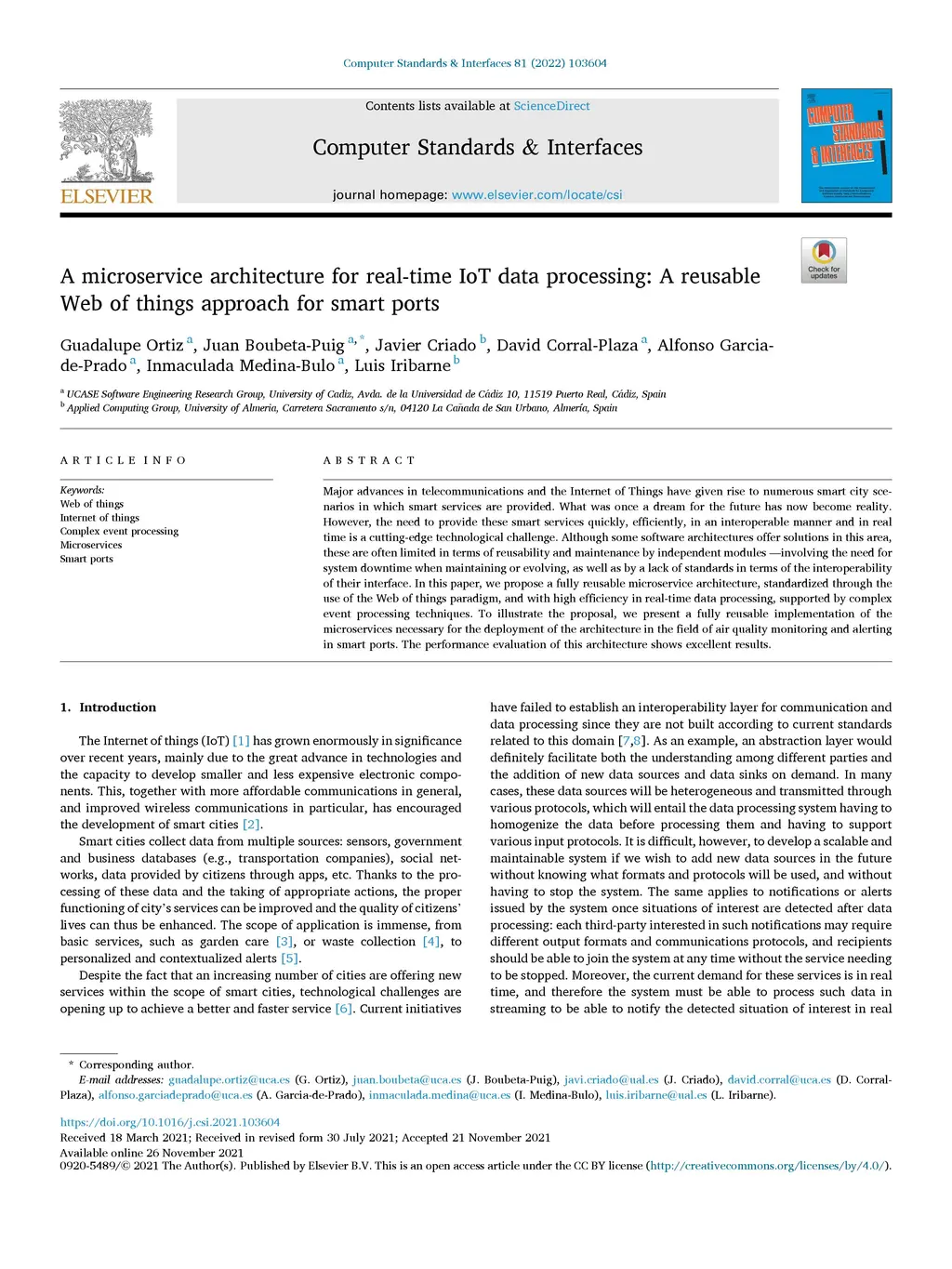Major advances in telecommunications and the Internet of Things have given rise to numerous smart city scenarios in which smart services are provided. What was once a dream for the future has now become reality. However, the need to provide these smart services quickly, efficiently, in an interoperable manner and in real time is a cutting-edge technological challenge. Although some software architectures offer solutions in this area, these are often limited in terms of reusability and maintenance by independent modules, involving the need for system downtime when maintaining or evolving, as well as by a lack of standards in terms of the interoperability of their interface. In this paper, we propose a fully reusable microservice architecture, standardized through the use of the Web of things paradigm, and with high efficiency in real-time data processing, supported by complex event processing techniques. To illustrate the proposal, we present a fully reusable implementation of the microservices necessary for the deployment of the architecture in the field of air quality monitoring and alerting in smart ports. The performance evaluation of this architecture shows excellent results.