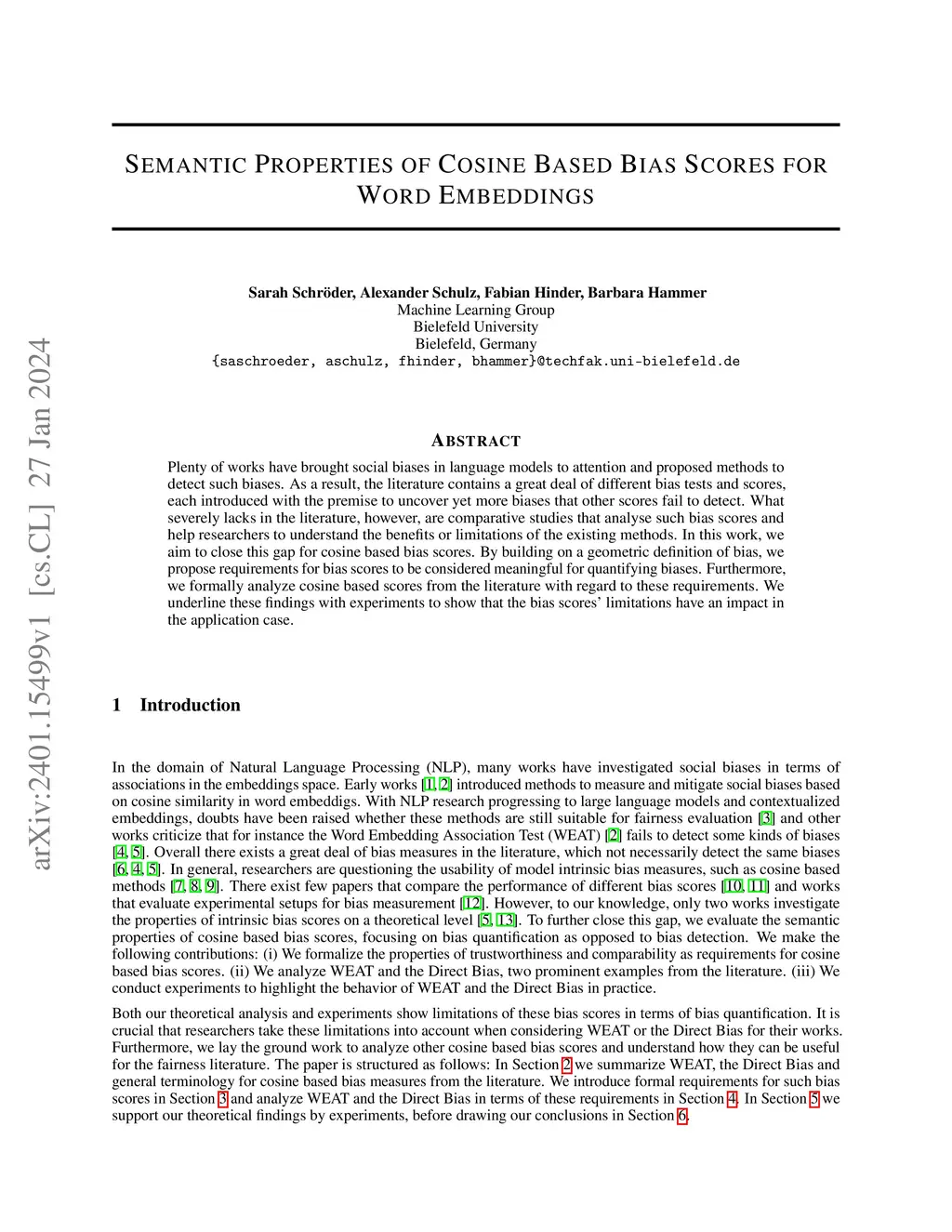 Semantic Properties of cosine based bias scores for word embeddings