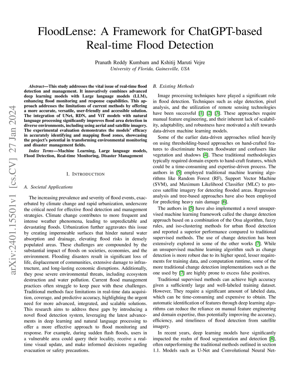 This study addresses the vital issue of real-time flood detection and management. It innovatively combines advanced deep learning models with Large language models (LLM), enhancing flood monitoring and response capabilities. This approach addresses the limitations of current methods by offering a more accurate, versatile, user-friendly and accessible solution. The integration of UNet, RDN, and ViT models with natural language processing significantly improves flood area detection in diverse environments, including using aerial and satellite imagery. The experimental evaluation demonstrates the models' efficacy in accurately identifying and mapping flood zones, showcasing the project's potential in transforming environmental monitoring and disaster management fields.