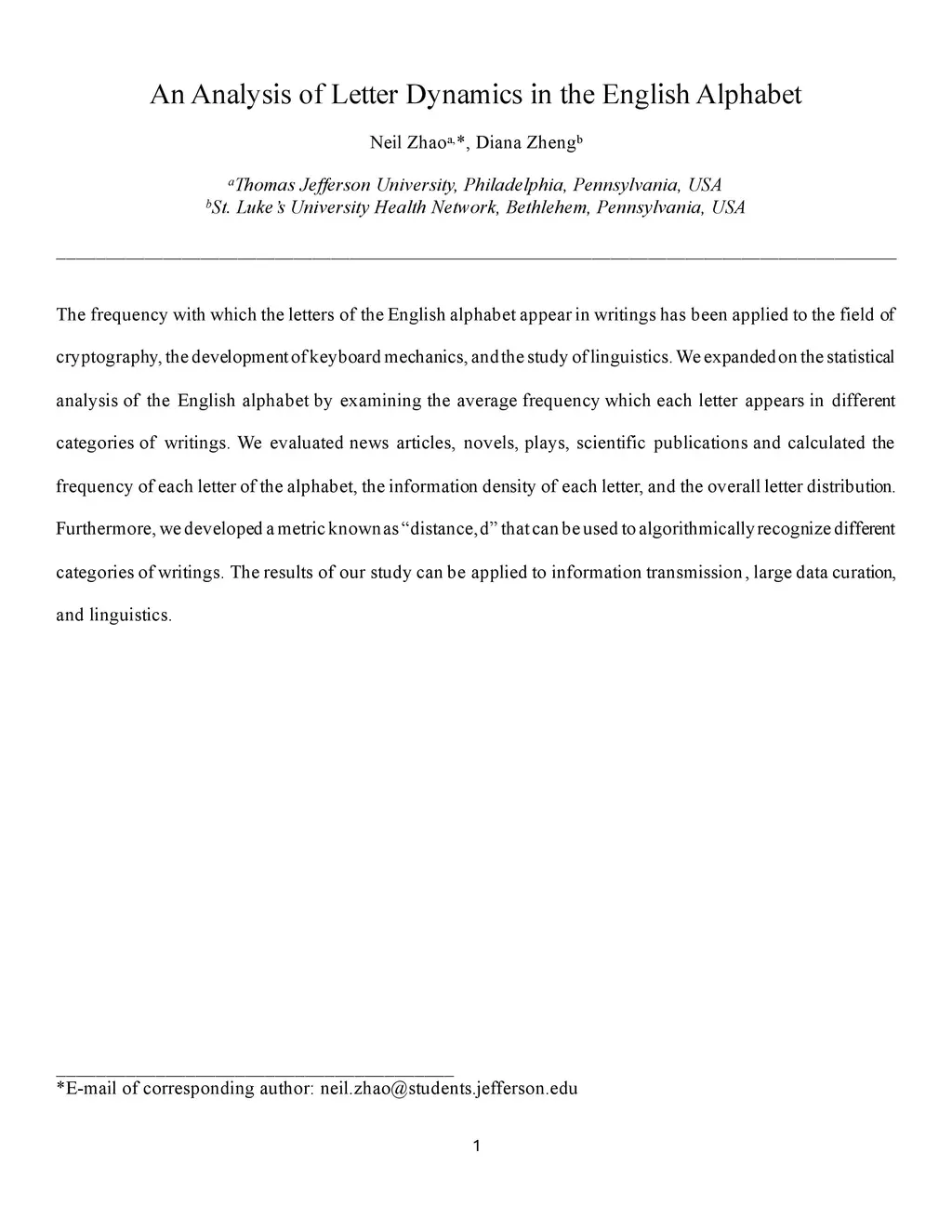 The frequency with which the letters of the English alphabet appear in writings has been applied to the field of cryptography, the development of keyboard mechanics, and the study of linguistics. We expanded on the statistical analysis of the English alphabet by examining the average frequency which each letter appears in different categories of writings. We evaluated news articles, novels, plays, scientific publications and calculated the frequency of each letter of the alphabet, the information density of each letter, and the overall letter distribution. Furthermore, we developed a metric known as distance, d that can be used to algorithmically recognize different categories of writings. The results of our study can be applied to information transmission, large data curation, and linguistics.