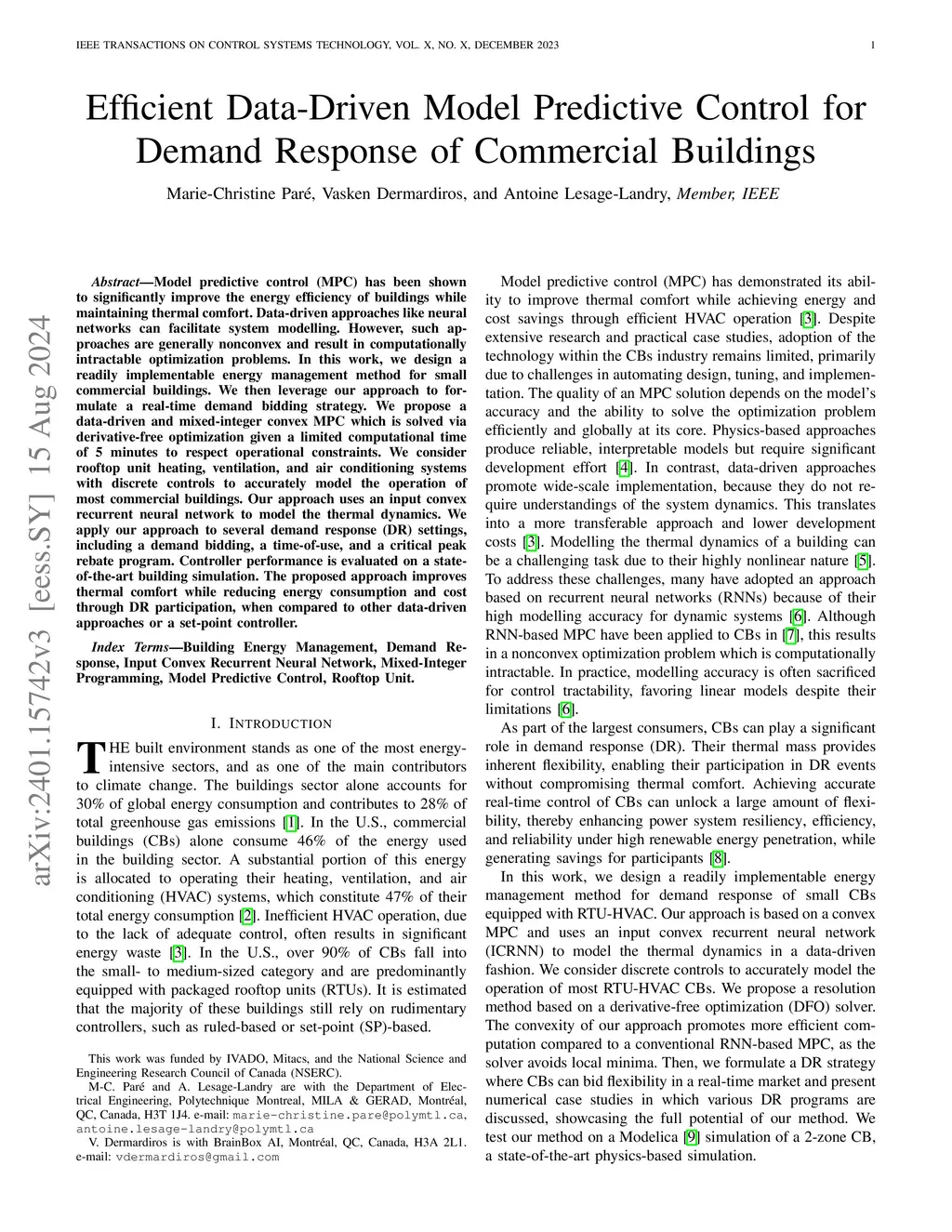 Model predictive control (MPC) has been shown to significantly improve the energy efficiency of buildings while maintaining thermal comfort. Data-driven approaches based on neural networks have been proposed to facilitate system modelling. However, such approaches are generally nonconvex and result in computationally intractable optimization problems. In this work, we design a readily implementable energy management method for small commercial buildings. We then leverage our approach to formulate a real-time demand bidding strategy. We propose a data-driven and mixed-integer convex MPC which is solved via derivative-free optimization given a limited computational time of 5 minutes to respect operational constraints. We consider rooftop unit heating, ventilation, and air conditioning systems with discrete controls to accurately model the operation of most commercial buildings. Our approach uses an input convex recurrent neural network to model the thermal dynamics. We apply our approach in several demand response (DR) settings, including a demand bidding, a time-of-use, and a critical peak rebate program. Controller performance is evaluated on a state-of-the-art building simulation. The proposed approach improves thermal comfort while reducing energy consumption and cost through DR participation, when compared to other data-driven approaches or a set-point controller.