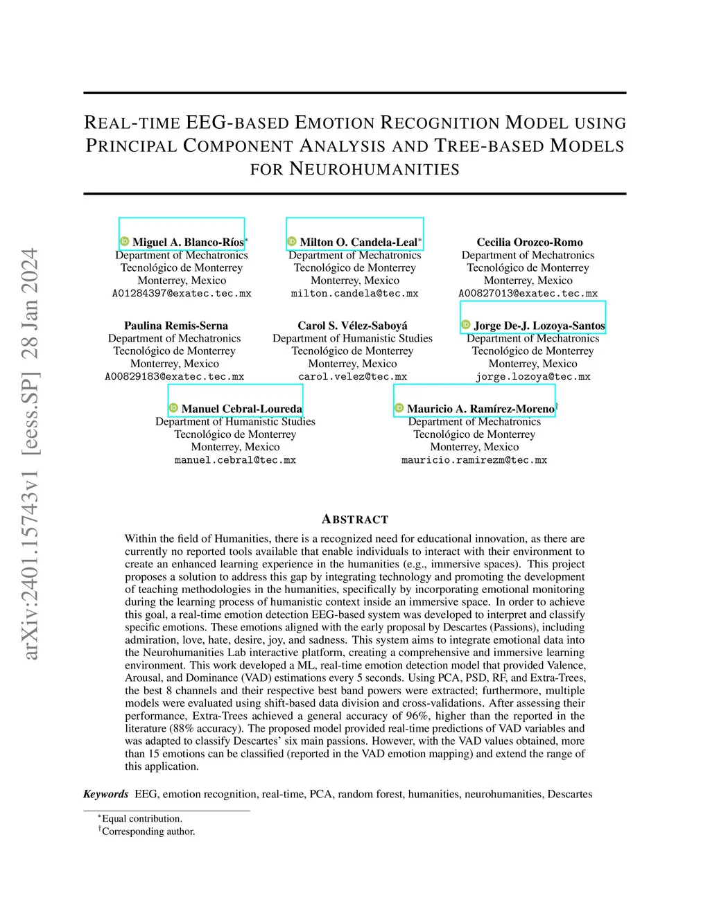Within the field of Humanities, there is a recognized need for educational innovation, as there are currently no reported tools available that enable individuals to interact with their environment to create an enhanced learning experience in the humanities (e.g., immersive spaces). This project proposes a solution to address this gap by integrating technology and promoting the development of teaching methodologies in the humanities, specifically by incorporating emotional monitoring during the learning process of humanistic context inside an immersive space. In order to achieve this goal, a real-time emotion detection EEG-based system was developed to interpret and classify specific emotions. These emotions aligned with the early proposal by Descartes (Passions), including admiration, love, hate, desire, joy, and sadness. This system aims to integrate emotional data into the Neurohumanities Lab interactive platform, creating a comprehensive and immersive learning environment. This work developed a ML, real-time emotion detection model that provided Valence, Arousal, and Dominance (VAD) estimations every 5 seconds. Using PCA, PSD, RF, and Extra-Trees, the best 8 channels and their respective best band powers were extracted; furthermore, multiple models were evaluated using shift-based data division and cross-validations. After assessing their performance, Extra-Trees achieved a general accuracy of 96%, higher than the reported in the literature (88% accuracy). The proposed model provided real-time predictions of VAD variables and was adapted to classify Descartes' six main passions. However, with the VAD values obtained, more than 15 emotions can be classified (reported in the VAD emotion mapping) and extend the range of this application.