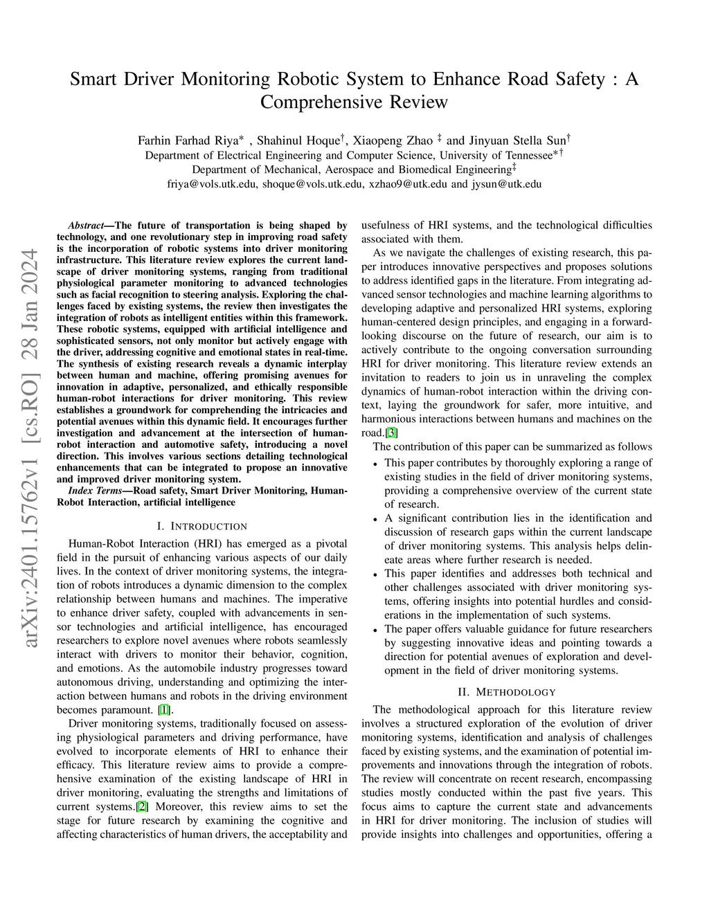 The future of transportation is being shaped by technology, and one revolutionary step in improving road safety is the incorporation of robotic systems into driver monitoring infrastructure. This literature review explores the current landscape of driver monitoring systems, ranging from traditional physiological parameter monitoring to advanced technologies such as facial recognition to steering analysis. Exploring the challenges faced by existing systems, the review then investigates the integration of robots as intelligent entities within this framework. These robotic systems, equipped with artificial intelligence and sophisticated sensors, not only monitor but actively engage with the driver, addressing cognitive and emotional states in real-time. The synthesis of existing research reveals a dynamic interplay between human and machine, offering promising avenues for innovation in adaptive, personalized, and ethically responsible human-robot interactions for driver monitoring. This review establishes a groundwork for comprehending the intricacies and potential avenues within this dynamic field. It encourages further investigation and advancement at the intersection of human-robot interaction and automotive safety, introducing a novel direction. This involves various sections detailing technological enhancements that can be integrated to propose an innovative and improved driver monitoring system.