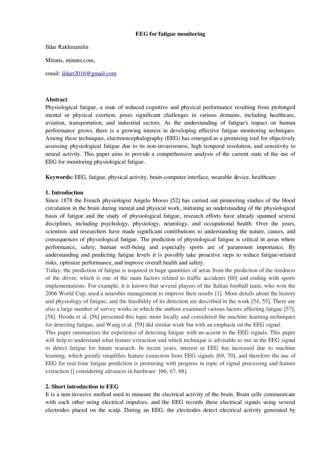 Physiological fatigue, a state of reduced cognitive and physical performance resulting from prolonged mental or physical exertion, poses significant challenges in various domains, including healthcare, aviation, transportation, and industrial sectors. As the understanding of fatigue's impact on human performance grows, there is a growing interest in developing effective fatigue monitoring techniques. Among these techniques, electroencephalography (EEG) has emerged as a promising tool for objectively assessing physiological fatigue due to its non-invasiveness, high temporal resolution, and sensitivity to neural activity. This paper aims to provide a comprehensive analysis of the current state of the use of EEG for monitoring physiological fatigue.