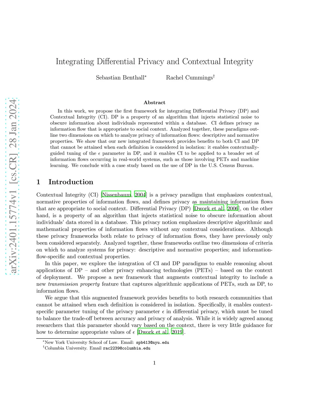 In this work, we propose the first framework for integrating Differential Privacy (DP) and Contextual Integrity (CI). DP is a property of an algorithm that injects statistical noise to obscure information about individuals represented within a database. CI defines privacy as information flow that is appropriate to social context. Analyzed together, these paradigms outline two dimensions on which to analyze privacy of information flows: descriptive and normative properties. We show that our new integrated framework provides benefits to both CI and DP that cannot be attained when each definition is considered in isolation: it enables contextually-guided tuning of the epsilon parameter in DP, and it enables CI to be applied to a broader set of information flows occurring in real-world systems, such as those involving PETs and machine learning. We conclude with a case study based on the use of DP in the U.S. Census Bureau.