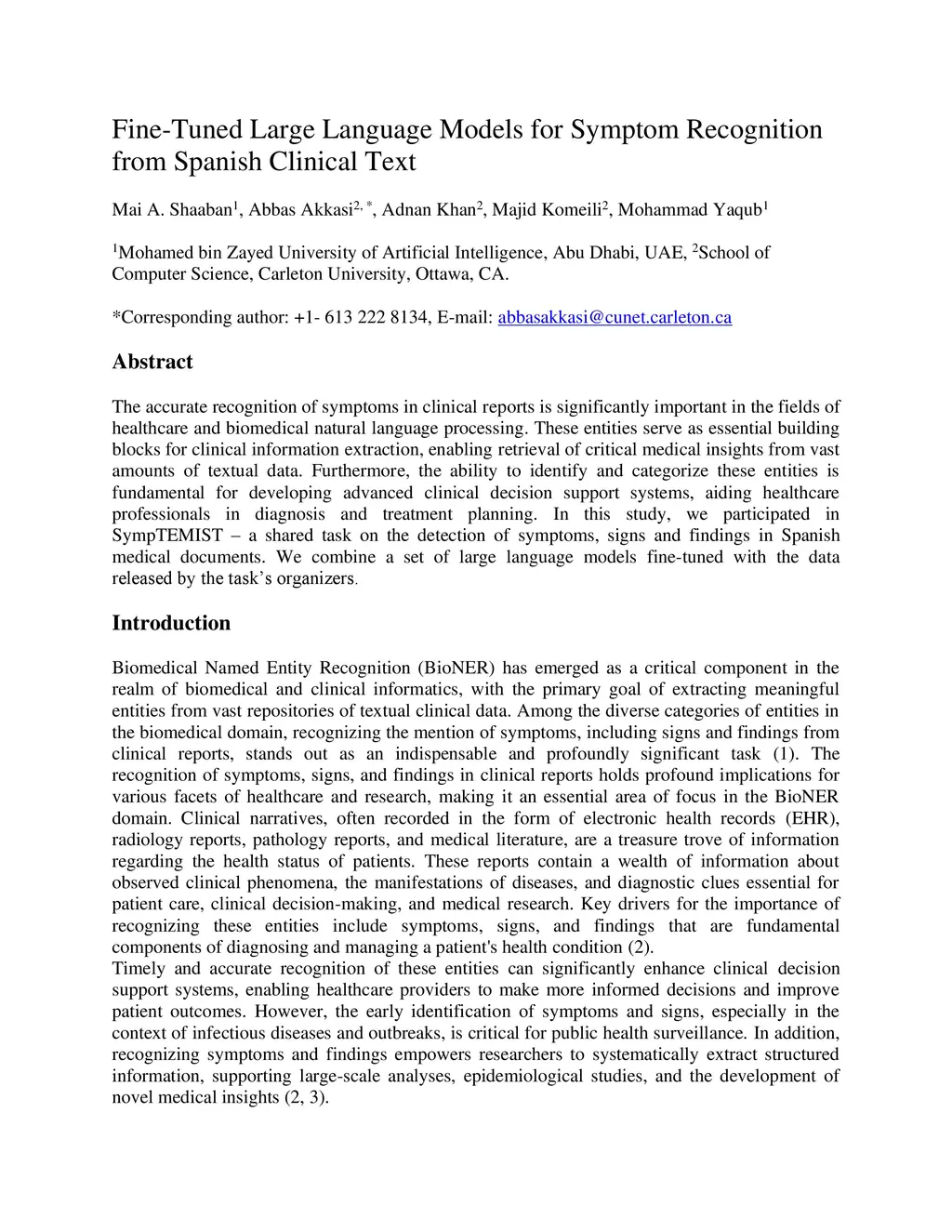 The accurate recognition of symptoms in clinical reports is significantly important in the fields of healthcare and biomedical natural language processing. These entities serve as essential building blocks for clinical information extraction, enabling retrieval of critical medical insights from vast amounts of textual data. Furthermore, the ability to identify and categorize these entities is fundamental for developing advanced clinical decision support systems, aiding healthcare professionals in diagnosis and treatment planning. In this study, we participated in SympTEMIST, a shared task on the detection of symptoms, signs and findings in Spanish medical documents. We combine a set of large language models fine-tuned with the data released by the organizers.