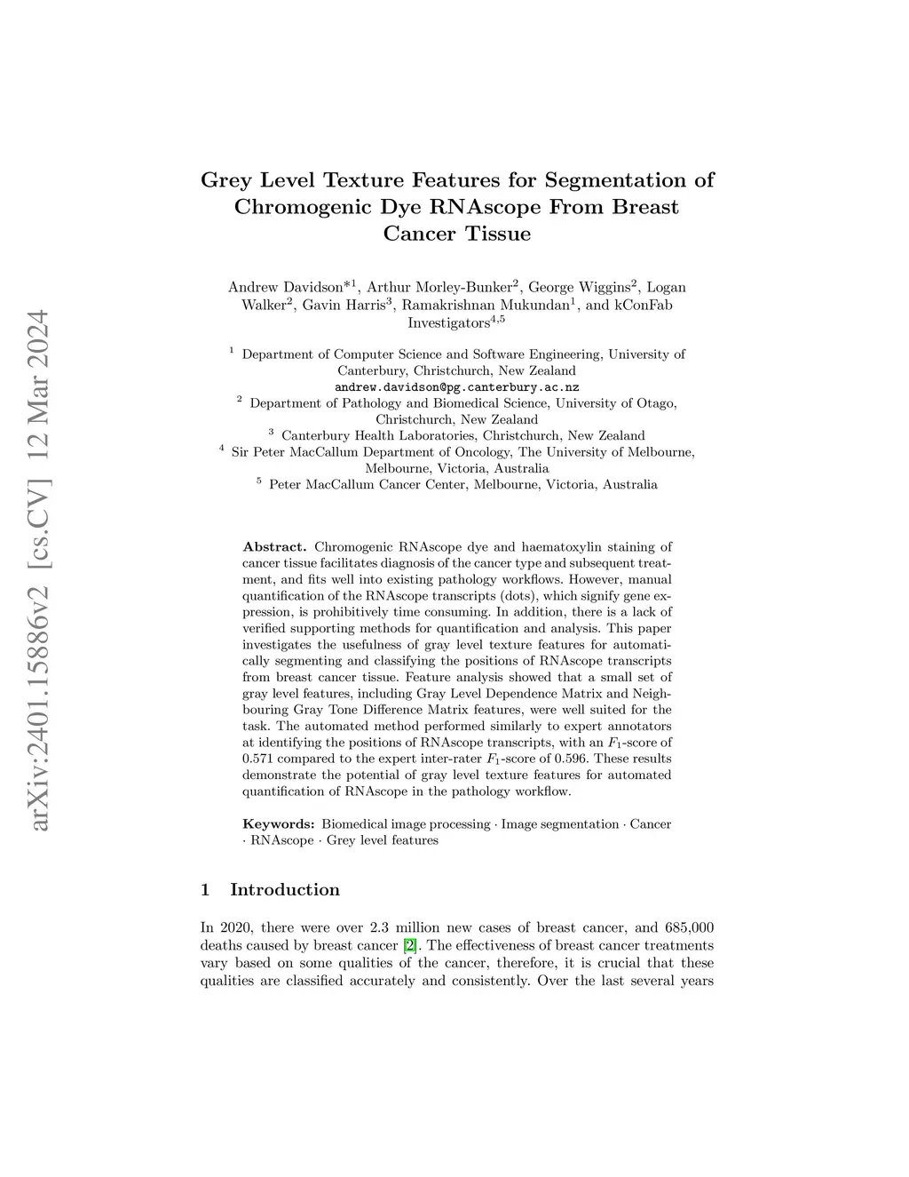 Chromogenic RNAscope dye and haematoxylin staining of cancer tissue facilitates diagnosis of the cancer type and subsequent treatment, and fits well into existing pathology workflows. However, manual quantification of the RNAscope transcripts (dots), which signify gene expression, is prohibitively time consuming. In addition, there is a lack of verified supporting methods for quantification and analysis. This paper investigates the usefulness of grey level texture features for automatically segmenting and classifying the positions of RNAscope transcripts from breast cancer tissue. Feature analysis showed that a small set of grey level features, including Grey Level Dependence Matrix and Neighbouring Grey Tone Difference Matrix features, were well suited for the task. The automated method performed similarly to expert annotators at identifying the positions of RNAscope transcripts, with an F1-score of 0.571 compared to the expert inter-rater F1-score of 0.596. These results demonstrate the potential of grey level texture features for automated quantification of RNAscope in the pathology workflow.