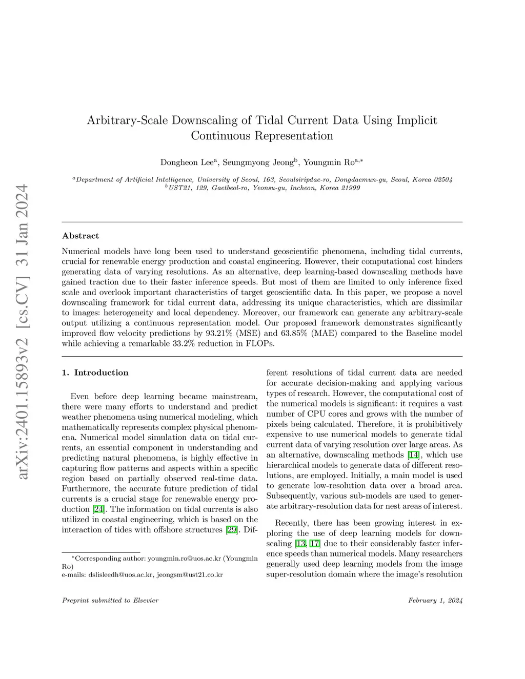 Numerical models have long been used to understand geoscientific phenomena, including tidal currents, crucial for renewable energy production and coastal engineering. However, their computational cost hinders generating data of varying resolutions. As an alternative, deep learning-based downscaling methods have gained traction due to their faster inference speeds. But most of them are limited to only inference fixed scale and overlook important characteristics of target geoscientific data. In this paper, we propose a novel downscaling framework for tidal current data, addressing its unique characteristics, which are dissimilar to images: heterogeneity and local dependency. Moreover, our framework can generate any arbitrary-scale output utilizing a continuous representation model. Our proposed framework demonstrates significantly improved flow velocity predictions by 93.21% (MSE) and 63.85% (MAE) compared to the Baseline model while achieving a remarkable 33.2% reduction in FLOPs.