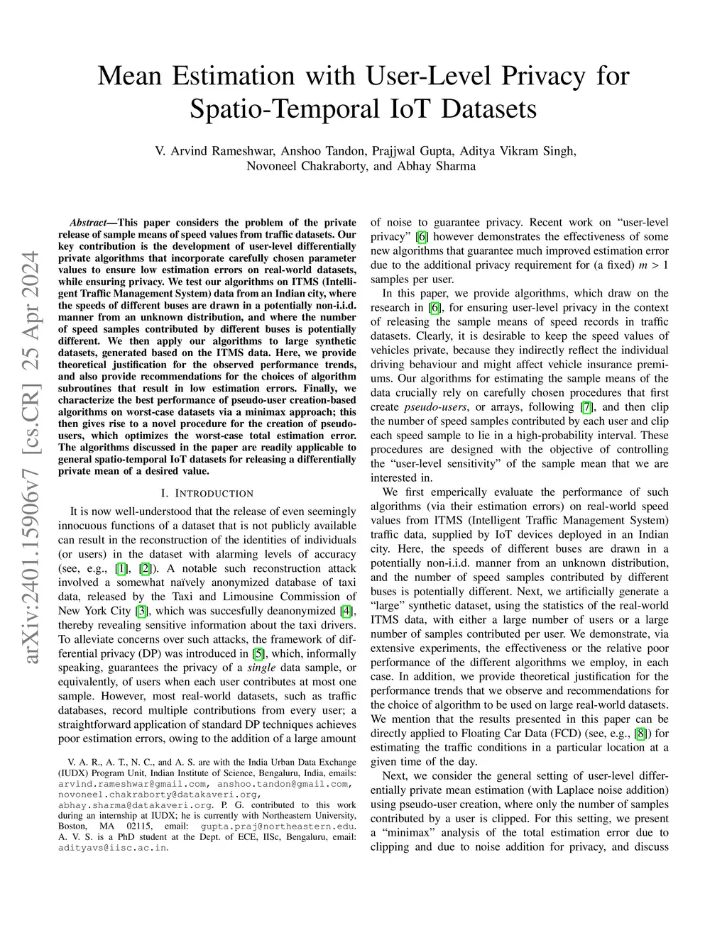 This paper considers the problem of the private release of sample means of speed values from traffic datasets. Our key contribution is the development of user-level differentially private algorithms that incorporate carefully chosen parameter values to ensure low estimation errors on real-world datasets, while ensuring privacy. We test our algorithms on ITMS (Intelligent Traffic Management System) data from an Indian city, where the speeds of different buses are drawn in a potentially non-i.i.d. manner from an unknown distribution, and where the number of speed samples contributed by different buses is potentially different. We then apply our algorithms to large synthetic datasets, generated based on the ITMS data. Here, we provide theoretical justification for the observed performance trends, and also provide recommendations for the choices of algorithm subroutines that result in low estimation errors. Finally, we characterize the best performance of pseudo-user creation-based algorithms on worst-case datasets via a minimax approach; this then gives rise to a novel procedure for the creation of pseudo-users, which optimizes the worst-case total estimation error. The algorithms discussed in the paper are readily applicable to general spatio-temporal IoT datasets for releasing a differentially private mean of a desired value.