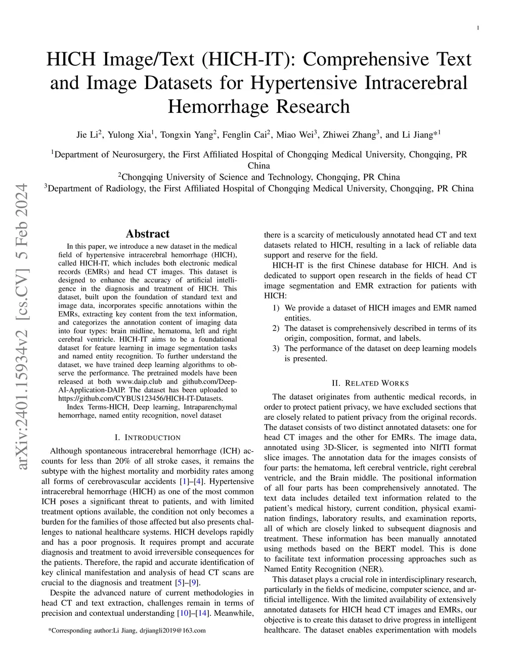 In this paper, we introduce a new dataset in the medical field of hypertensive intracerebral hemorrhage (HICH), called HICH-IT, which includes both electronic medical records (EMRs) and head CT images. This dataset is designed to enhance the accuracy of artificial intelligence in the diagnosis and treatment of HICH. This dataset, built upon the foundation of standard text and image data, incorporates specific annotations within the EMRs, extracting key content from the text information, and categorizes the annotation content of imaging data into four types: brain midline, hematoma, left and right cerebral ventricle. HICH-IT aims to be a foundational dataset for feature learning in image segmentation tasks and named entity recognition. To further understand the dataset, we have trained deep learning algorithms to observe the performance. The pretrained models have been released at both www.daip.club and github.com/Deep-AI-Application-DAIP. The dataset has been uploaded to https://github.com/CYBUS123456/HICH-IT-Datasets. Index Terms-HICH, Deep learning, Intraparenchymal hemorrhage, named entity recognition, novel dataset