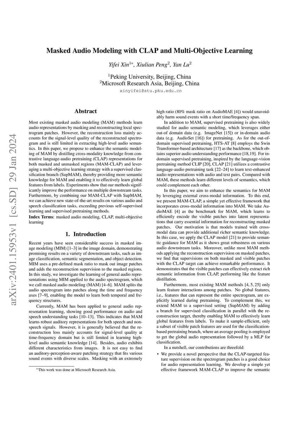 Masked Audio Modeling with CLAP and Multi-Objective Learning
