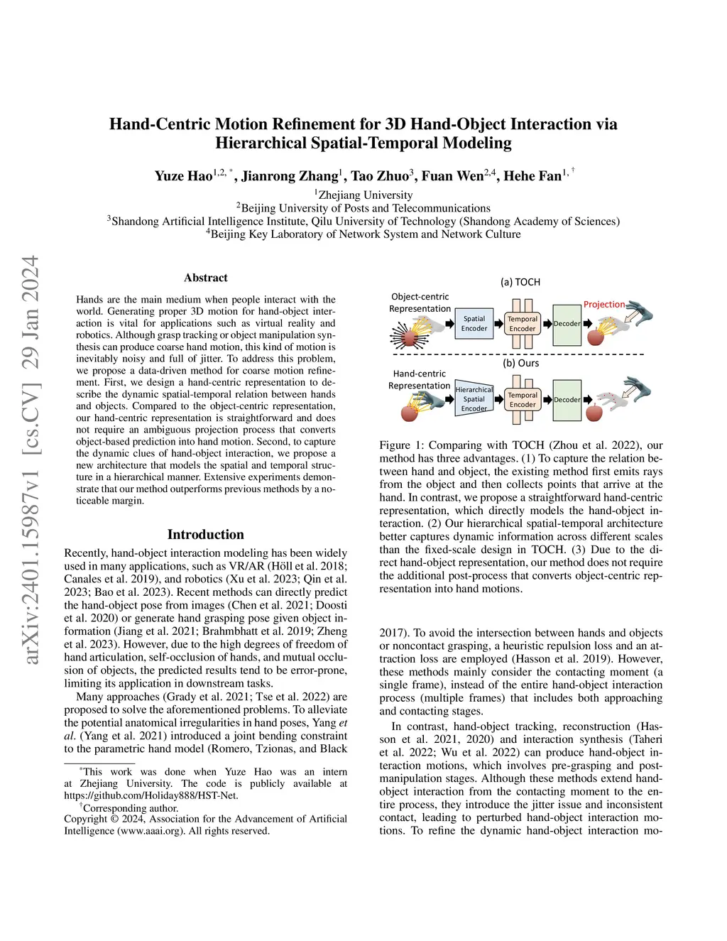 Hands are the main medium when people interact with the world. Generating proper 3D motion for hand-object interaction is vital for applications such as virtual reality and robotics. Although grasp tracking or object manipulation synthesis can produce coarse hand motion, this kind of motion is inevitably noisy and full of jitter. To address this problem, we propose a data-driven method for coarse motion refinement. First, we design a hand-centric representation to describe the dynamic spatial-temporal relation between hands and objects. Compared to the object-centric representation, our hand-centric representation is straightforward and does not require an ambiguous projection process that converts object-based prediction into hand motion. Second, to capture the dynamic clues of hand-object interaction, we propose a new architecture that models the spatial and temporal structure in a hierarchical manner. Extensive experiments demonstrate that our method outperforms previous methods by a noticeable margin.
