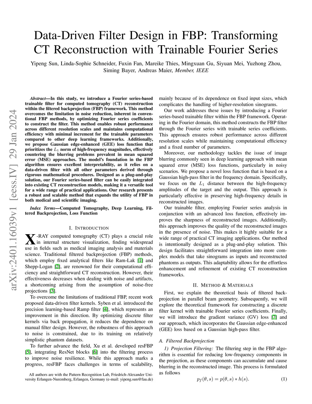 In this study, we introduce a Fourier series-based trainable filter for computed tomography (CT) reconstruction within the filtered backprojection (FBP) framework. This method overcomes the limitation in noise reduction, inherent in conventional FBP methods, by optimizing Fourier series coefficients to construct the filter. This method enables robust performance across different resolution scales and maintains computational efficiency with minimal increment for the trainable parameters compared to other deep learning frameworks. Additionally, we propose Gaussian edge-enhanced (GEE) loss function that prioritizes the norm of high-frequency magnitudes, effectively countering the blurring problems prevalent in mean squared error (MSE) approaches. The model's foundation in the FBP algorithm ensures excellent interpretability, as it relies on a data-driven filter with all other parameters derived through rigorous mathematical procedures. Designed as a plug-and-play solution, our Fourier series-based filter can be easily integrated into existing CT reconstruction models, making it a versatile tool for a wide range of practical applications. Our research presents a robust and scalable method that expands the utility of FBP in both medical and scientific imaging.