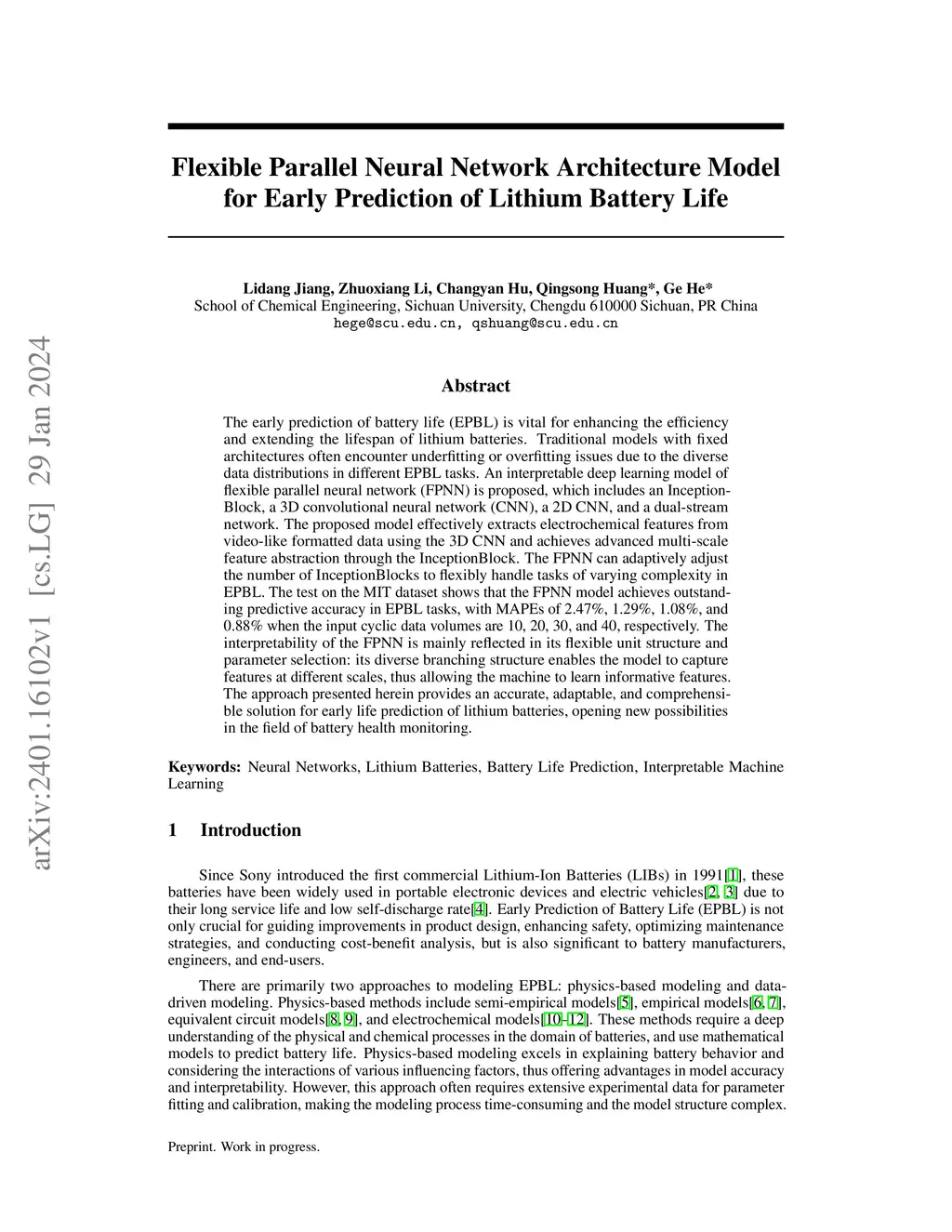 The early prediction of battery life (EPBL) is vital for enhancing the efficiency and extending the lifespan of lithium batteries. Traditional models with fixed architectures often encounter underfitting or overfitting issues due to the diverse data distributions in different EPBL tasks. An interpretable deep learning model of flexible parallel neural network (FPNN) is proposed, which includes an InceptionBlock, a 3D convolutional neural network (CNN), a 2D CNN, and a dual-stream network. The proposed model effectively extracts electrochemical features from video-like formatted data using the 3D CNN and achieves advanced multi-scale feature abstraction through the InceptionBlock. The FPNN can adaptively adjust the number of InceptionBlocks to flexibly handle tasks of varying complexity in EPBL. The test on the MIT dataset shows that the FPNN model achieves outstanding predictive accuracy in EPBL tasks, with MAPEs of 2.47%, 1.29%, 1.08%, and 0.88% when the input cyclic data volumes are 10, 20, 30, and 40, respectively. The interpretability of the FPNN is mainly reflected in its flexible unit structure and parameter selection: its diverse branching structure enables the model to capture features at different scales, thus allowing the machine to learn informative features. The approach presented herein provides an accurate, adaptable, and comprehensible solution for early life prediction of lithium batteries, opening new possibilities in the field of battery health monitoring.