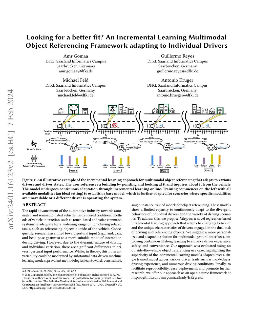The rapid advancement of the automotive industry towards automated and semi-automated vehicles has rendered traditional methods of vehicle interaction, such as touch-based and voice command systems, inadequate for a widening range of non-driving related tasks, such as referencing objects outside of the vehicle. Consequently, research has shifted toward gestural input (e.g., hand, gaze, and head pose gestures) as a more suitable mode of interaction during driving. However, due to the dynamic nature of driving and individual variation, there are significant differences in drivers' gestural input performance. While, in theory, this inherent variability could be moderated by substantial data-driven machine learning models, prevalent methodologies lean towards constrained, single-instance trained models for object referencing. These models show a limited capacity to continuously adapt to the divergent behaviors of individual drivers and the variety of driving scenarios. To address this, we propose \textit{IcRegress}, a novel regression-based incremental learning approach that adapts to changing behavior and the unique characteristics of drivers engaged in the dual task of driving and referencing objects. We suggest a more personalized and adaptable solution for multimodal gestural interfaces, employing continuous lifelong learning to enhance driver experience, safety, and convenience. Our approach was evaluated using an outside-the-vehicle object referencing use case, highlighting the superiority of the incremental learning models adapted over a single trained model across various driver traits such as handedness, driving experience, and numerous driving conditions. Finally, to facilitate reproducibility, ease deployment, and promote further research, we offer our approach as an open-source framework at \url{https://github.com/amrgomaaelhady/IcRegress}.