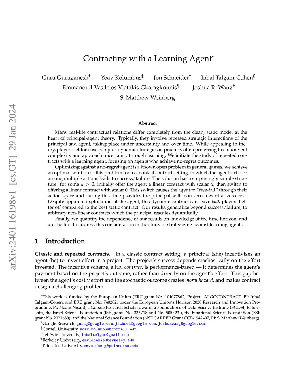 Many real-life contractual relations differ completely from the clean, static model at the heart of principal-agent theory. Typically, they involve repeated strategic interactions of the principal and agent, taking place under uncertainty and over time. While appealing in theory, players seldom use complex dynamic strategies in practice, often preferring to circumvent complexity and approach uncertainty through learning. We initiate the study of repeated contracts with a learning agent, focusing on agents who achieve no-regret outcomes. Optimizing against a no-regret agent is a known open problem in general games; we achieve an optimal solution to this problem for a canonical contract setting, in which the agent's choice among multiple actions leads to success/failure. The solution has a surprisingly simple structure: for some , initially offer the agent a linear contract with scalar , then switch to offering a linear contract with scalar . This switch causes the agent to ``free-fall'' through their action space and during this time provides the principal with non-zero reward at zero cost. Despite apparent exploitation of the agent, this dynamic contract can leave \emph{both} players better off compared to the best static contract. Our results generalize beyond success/failure, to arbitrary non-linear contracts which the principal rescales dynamically. Finally, we quantify the dependence of our results on knowledge of the time horizon, and are the first to address this consideration in the study of strategizing against learning agents.
