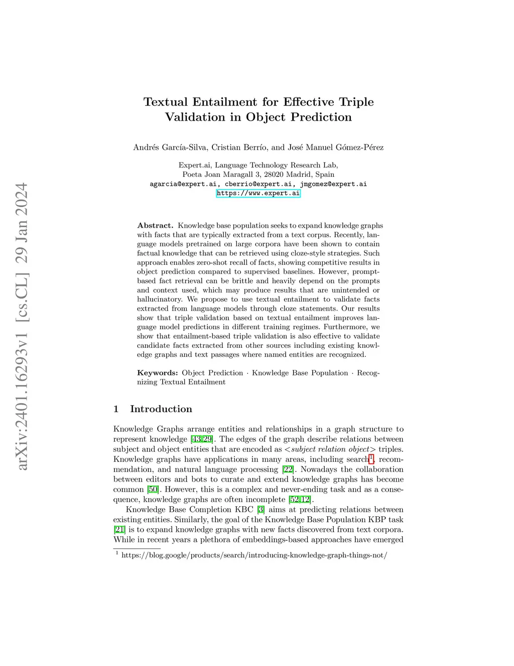 Textual Entailment for Effective Triple Validation in Object Prediction