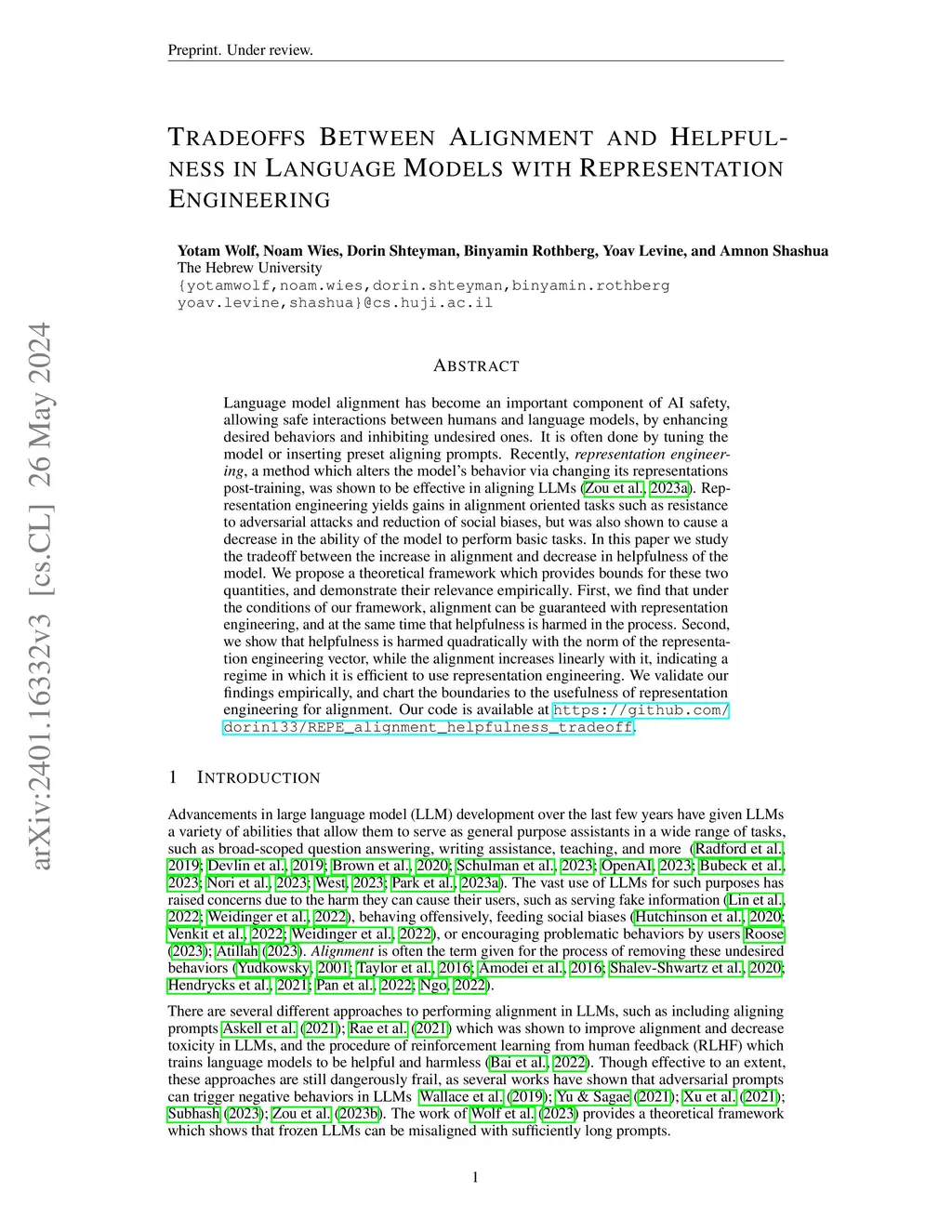 Language model alignment has become an important component of AI safety, allowing safe interactions between humans and language models, by enhancing desired behaviors and inhibiting undesired ones. It is often done by tuning the model or inserting preset aligning prompts. Recently, representation engineering, a method which alters the model's behavior via changing its representations post-training, was shown to be effective in aligning LLMs (Zou et al., 2023a). Representation engineering yields gains in alignment oriented tasks such as resistance to adversarial attacks and reduction of social biases, but was also shown to cause a decrease in the ability of the model to perform basic tasks. In this paper we study the tradeoff between the increase in alignment and decrease in helpfulness of the model. We propose a theoretical framework which provides bounds for these two quantities, and demonstrate their relevance empirically. First, we find that under the conditions of our framework, alignment can be guaranteed with representation engineering, and at the same time that helpfulness is harmed in the process. Second, we show that helpfulness is harmed quadratically with the norm of the representation engineering vector, while the alignment increases linearly with it, indicating a regime in which it is efficient to use representation engineering. We validate our findings empirically, and chart the boundaries to the usefulness of representation engineering for alignment.