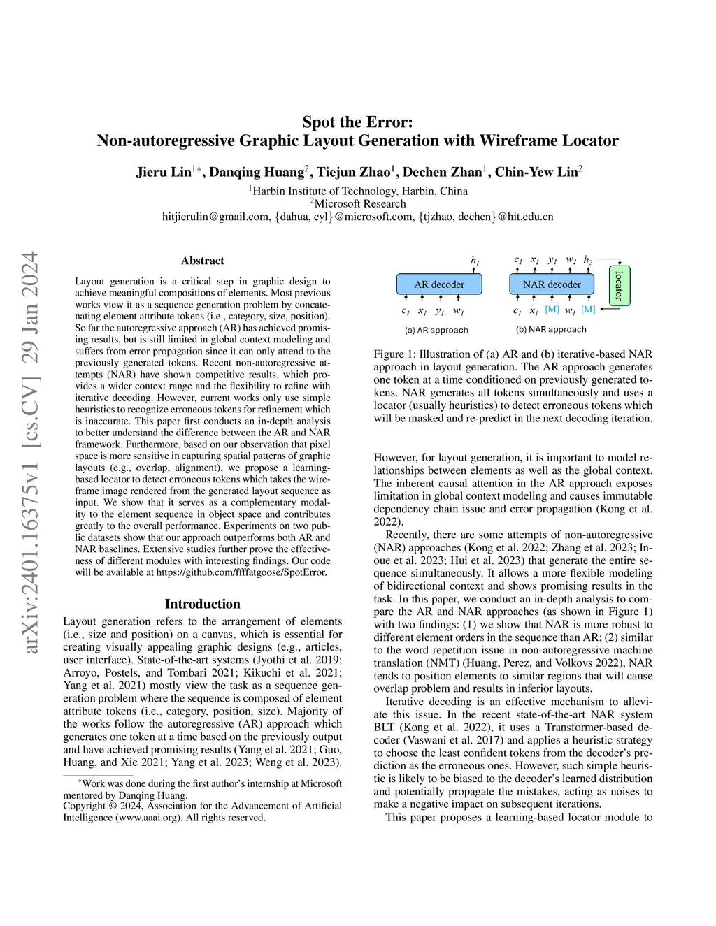 Layout generation is a critical step in graphic design to achieve meaningful compositions of elements. Most previous works view it as a sequence generation problem by concatenating element attribute tokens (i.e., category, size, position). So far the autoregressive approach (AR) has achieved promising results, but is still limited in global context modeling and suffers from error propagation since it can only attend to the previously generated tokens. Recent non-autoregressive attempts (NAR) have shown competitive results, which provides a wider context range and the flexibility to refine with iterative decoding. However, current works only use simple heuristics to recognize erroneous tokens for refinement which is inaccurate. This paper first conducts an in-depth analysis to better understand the difference between the AR and NAR framework. Furthermore, based on our observation that pixel space is more sensitive in capturing spatial patterns of graphic layouts (e.g., overlap, alignment), we propose a learning-based locator to detect erroneous tokens which takes the wireframe image rendered from the generated layout sequence as input. We show that it serves as a complementary modality to the element sequence in object space and contributes greatly to the overall performance. Experiments on two public datasets show that our approach outperforms both AR and NAR baselines. Extensive studies further prove the effectiveness of different modules with interesting findings. Our code will be available at https://github.com/ffffatgoose/SpotError.
