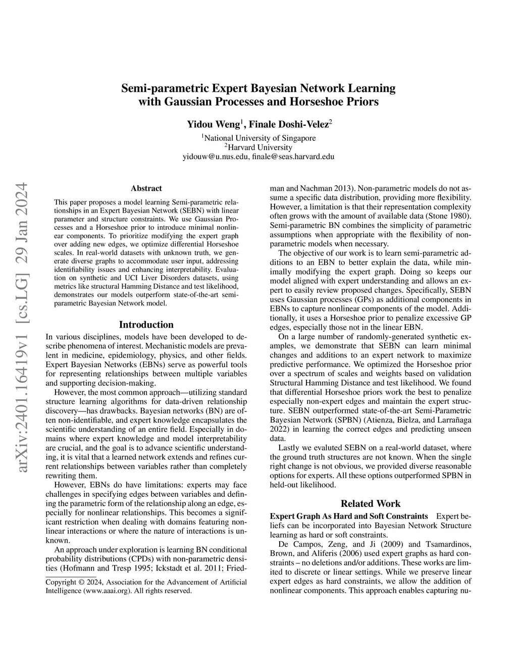 This paper proposes a model learning Semi-parametric relationships in an Expert Bayesian Network (SEBN) with linear parameter and structure constraints. We use Gaussian Processes and a Horseshoe prior to introduce minimal nonlinear components. To prioritize modifying the expert graph over adding new edges, we optimize differential Horseshoe scales. In real-world datasets with unknown truth, we generate diverse graphs to accommodate user input, addressing identifiability issues and enhancing interpretability. Evaluation on synthetic and UCI Liver Disorders datasets, using metrics like structural Hamming Distance and test likelihood, demonstrates our models outperform state-of-the-art semi-parametric Bayesian Network model.