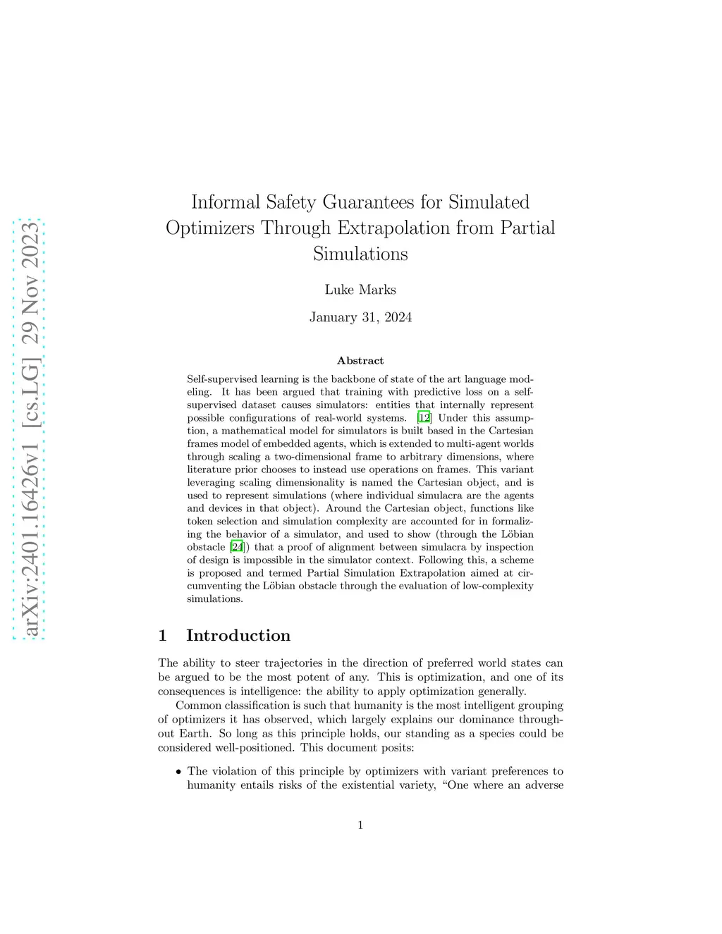 Self-supervised learning is the backbone of state of the art language modeling. It has been argued that training with predictive loss on a self-supervised dataset causes simulators: entities that internally represent possible configurations of real-world systems. Under this assumption, a mathematical model for simulators is built based in the Cartesian frames model of embedded agents, which is extended to multi-agent worlds through scaling a two-dimensional frame to arbitrary dimensions, where literature prior chooses to instead use operations on frames. This variant leveraging scaling dimensionality is named the Cartesian object, and is used to represent simulations (where individual simulacra are the agents and devices in that object). Around the Cartesian object, functions like token selection and simulation complexity are accounted for in formalizing the behavior of a simulator, and used to show (through the L\"obian obstacle) that a proof of alignment between simulacra by inspection of design is impossible in the simulator context. Following this, a scheme is proposed and termed Partial Simulation Extrapolation aimed at circumventing the L\"obian obstacle through the evaluation of low-complexity simulations.