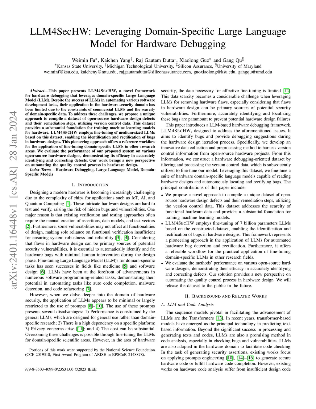 This paper presents LLM4SecHW, a novel framework for hardware debugging that leverages domain specific Large Language Model (LLM). Despite the success of LLMs in automating various software development tasks, their application in the hardware security domain has been limited due to the constraints of commercial LLMs and the scarcity of domain specific data. To address these challenges, we propose a unique approach to compile a dataset of open source hardware design defects and their remediation steps, utilizing version control data. This dataset provides a substantial foundation for training machine learning models for hardware. LLM4SecHW employs fine tuning of medium sized LLMs based on this dataset, enabling the identification and rectification of bugs in hardware designs. This pioneering approach offers a reference workflow for the application of fine tuning domain specific LLMs in other research areas. We evaluate the performance of our proposed system on various open source hardware designs, demonstrating its efficacy in accurately identifying and correcting defects. Our work brings a new perspective on automating the quality control process in hardware design.