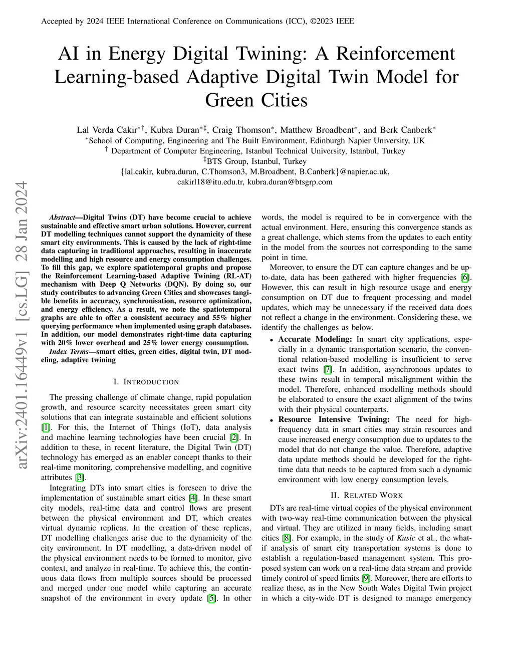 Digital Twins (DT) have become crucial to achieve sustainable and effective smart urban solutions. However, current DT modelling techniques cannot support the dynamicity of these smart city environments. This is caused by the lack of right-time data capturing in traditional approaches, resulting in inaccurate modelling and high resource and energy consumption challenges. To fill this gap, we explore spatiotemporal graphs and propose the Reinforcement Learning-based Adaptive Twining (RL-AT) mechanism with Deep Q Networks (DQN). By doing so, our study contributes to advancing Green Cities and showcases tangible benefits in accuracy, synchronisation, resource optimization, and energy efficiency. As a result, we note the spatiotemporal graphs are able to offer a consistent accuracy and 55% higher querying performance when implemented using graph databases. In addition, our model demonstrates right-time data capturing with 20% lower overhead and 25% lower energy consumption.