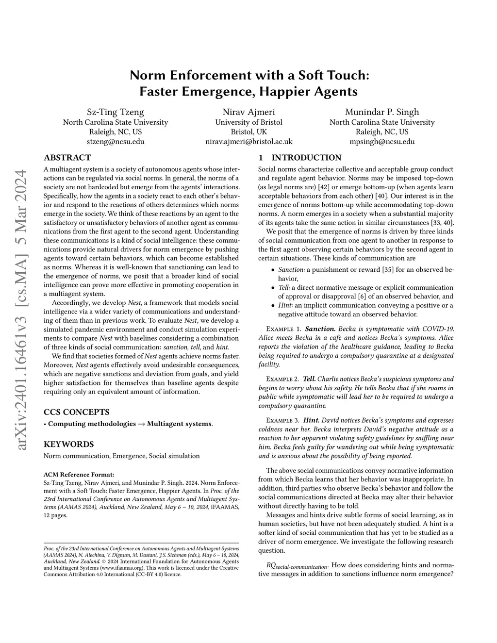 A multiagent system is a society of autonomous agents whose interactions can be regulated via social norms. In general, the norms of a society are not hardcoded but emerge from the agents' interactions. Specifically, how the agents in a society react to each other's behavior and respond to the reactions of others determines which norms emerge in the society. We think of these reactions by an agent to the satisfactory or unsatisfactory behaviors of another agent as communications from the first agent to the second agent. Understanding these communications is a kind of social intelligence: these communications provide natural drivers for norm emergence by pushing agents toward certain behaviors, which can become established as norms. Whereas it is well-known that sanctioning can lead to the emergence of norms, we posit that a broader kind of social intelligence can prove more effective in promoting cooperation in a multiagent system. Accordingly, we develop Nest, a framework that models social intelligence via a wider variety of communications and understanding of them than in previous work. To evaluate Nest, we develop a simulated pandemic environment and conduct simulation experiments to compare Nest with baselines considering a combination of three kinds of social communication: sanction, tell, and hint. We find that societies formed of Nest agents achieve norms faster. Moreover, Nest agents effectively avoid undesirable consequences, which are negative sanctions and deviation from goals, and yield higher satisfaction for themselves than baseline agents despite requiring only an equivalent amount of information.