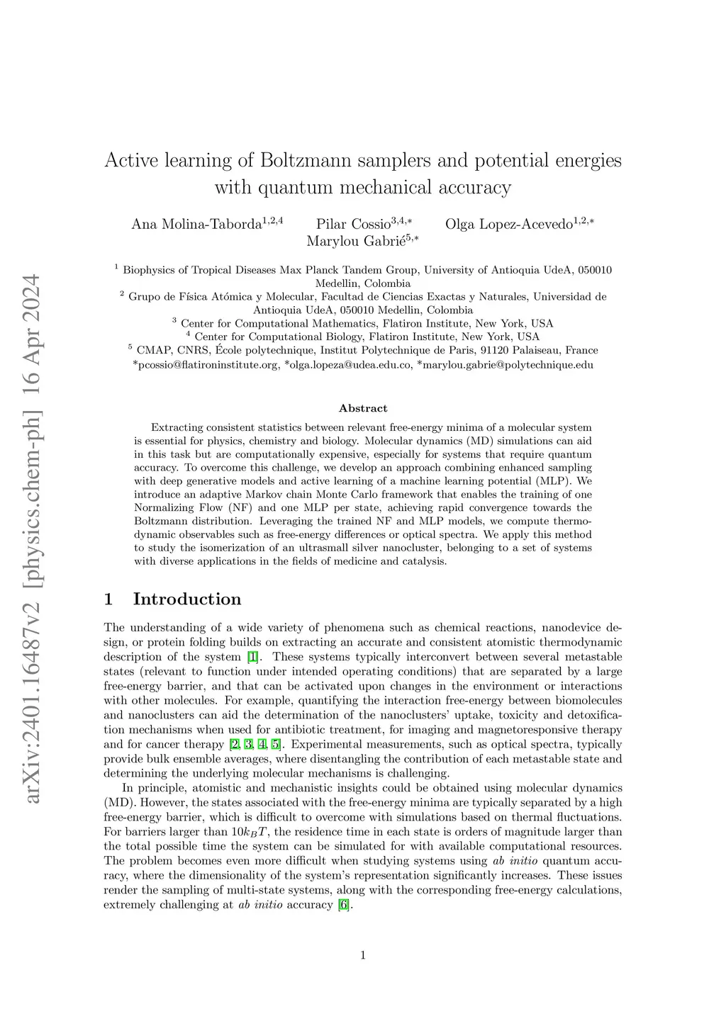 Extracting consistent statistics between relevant free-energy minima of a molecular system is essential for physics, chemistry and biology. Molecular dynamics (MD) simulations can aid in this task but are computationally expensive, especially for systems that require quantum accuracy. To overcome this challenge, we develop an approach combining enhanced sampling with deep generative models and active learning of a machine learning potential (MLP). We introduce an adaptive Markov chain Monte Carlo framework that enables the training of one Normalizing Flow (NF) and one MLP per state, achieving rapid convergence towards the Boltzmann distribution. Leveraging the trained NF and MLP models, we compute thermodynamic observables such as free-energy differences or optical spectra. We apply this method to study the isomerization of an ultrasmall silver nanocluster, belonging to a set of systems with diverse applications in the fields of medicine and catalysis.