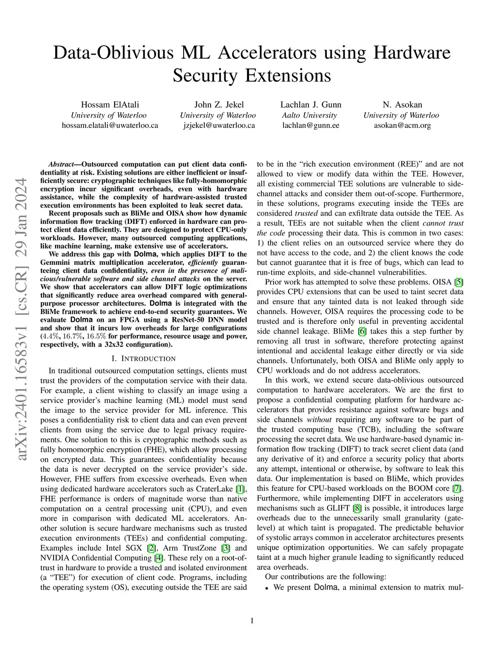 Outsourced computation can put client data confidentiality at risk. Existing solutions are either inefficient or insufficiently secure: cryptographic techniques like fully-homomorphic encryption incur significant overheads, even with hardware assistance, while the complexity of hardware-assisted trusted execution environments has been exploited to leak secret data. Recent proposals such as BliMe and OISA show how dynamic information flow tracking (DIFT) enforced in hardware can protect client data efficiently. They are designed to protect CPU-only workloads. However, many outsourced computing applications, like machine learning, make extensive use of accelerators. We address this gap with Dolma, which applies DIFT to the Gemmini matrix multiplication accelerator, efficiently guaranteeing client data confidentiality, even in the presence of malicious/vulnerable software and side channel attacks on the server. We show that accelerators can allow DIFT logic optimizations that significantly reduce area overhead compared with general-purpose processor architectures. Dolma is integrated with the BliMe framework to achieve end-to-end security guarantees. We evaluate Dolma on an FPGA using a ResNet-50 DNN model and show that it incurs low overheads for large configurations (, , for performance, resource usage and power, respectively, with a 32x32 configuration).