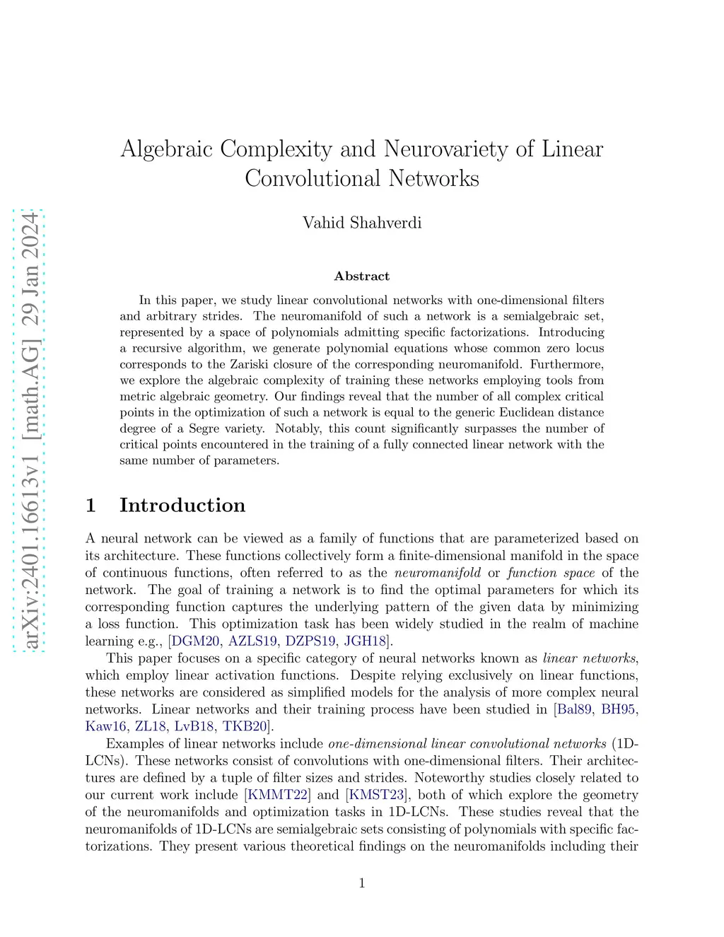 In this paper, we study linear convolutional networks with one-dimensional filters and arbitrary strides. The neuromanifold of such a network is a semialgebraic set, represented by a space of polynomials admitting specific factorizations. Introducing a recursive algorithm, we generate polynomial equations whose common zero locus corresponds to the Zariski closure of the corresponding neuromanifold. Furthermore, we explore the algebraic complexity of training these networks employing tools from metric algebraic geometry. Our findings reveal that the number of all complex critical points in the optimization of such a network is equal to the generic Euclidean distance degree of a Segre variety. Notably, this count significantly surpasses the number of critical points encountered in the training of a fully connected linear network with the same number of parameters.