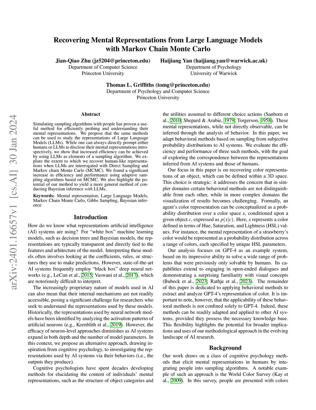 Simulating sampling algorithms with people has proven a useful method for efficiently probing and understanding their mental representations. We propose that the same methods can be used to study the representations of Large Language Models (LLMs). While one can always directly prompt either humans or LLMs to disclose their mental representations introspectively, we show that increased efficiency can be achieved by using LLMs as elements of a sampling algorithm. We explore the extent to which we recover human-like representations when LLMs are interrogated with Direct Sampling and Markov chain Monte Carlo (MCMC). We found a significant increase in efficiency and performance using adaptive sampling algorithms based on MCMC. We also highlight the potential of our method to yield a more general method of conducting Bayesian inference \textit{with} LLMs.