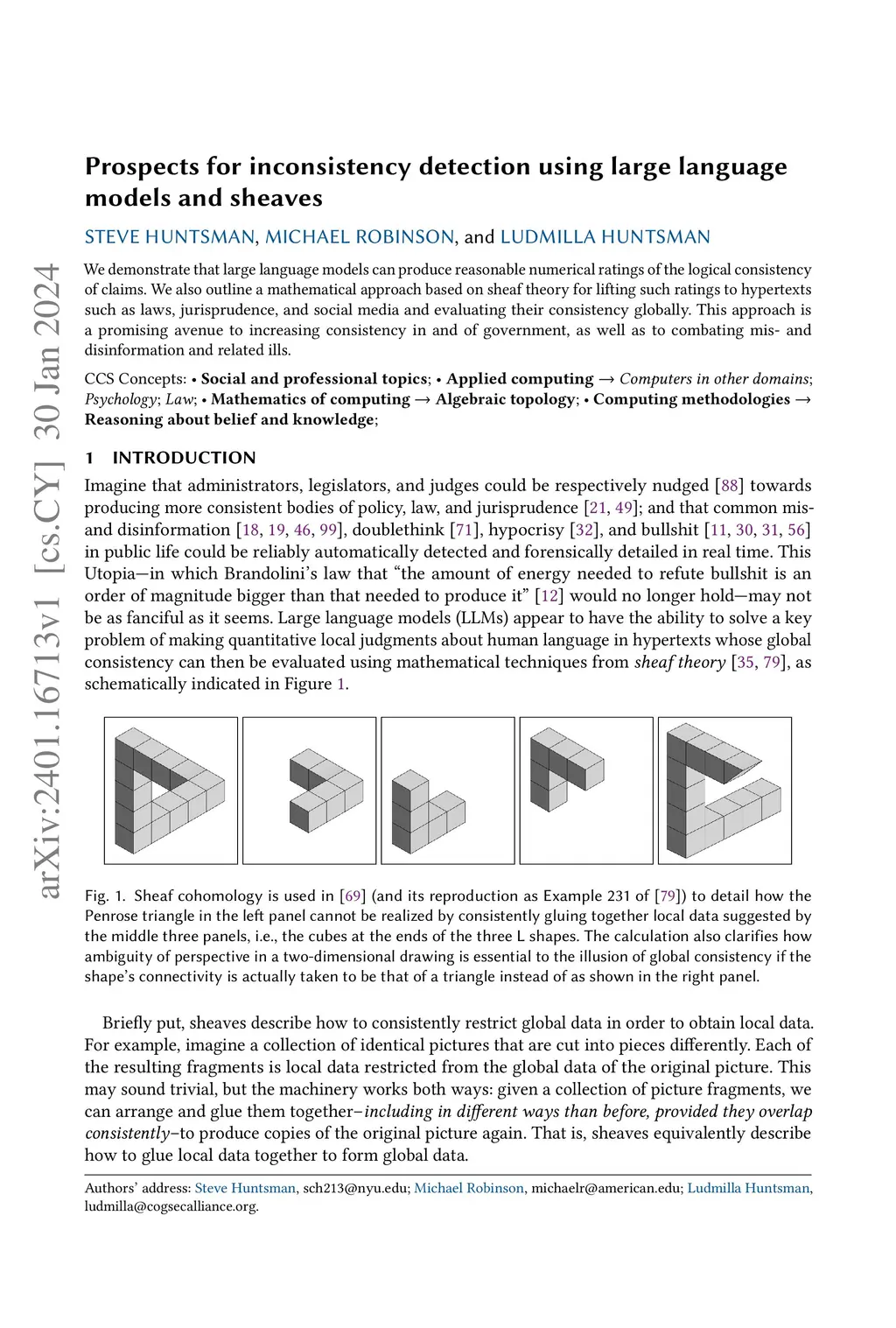 We demonstrate that large language models can produce reasonable numerical ratings of the logical consistency of claims. We also outline a mathematical approach based on sheaf theory for lifting such ratings to hypertexts such as laws, jurisprudence, and social media and evaluating their consistency globally. This approach is a promising avenue to increasing consistency in and of government, as well as to combating mis- and disinformation and related ills.