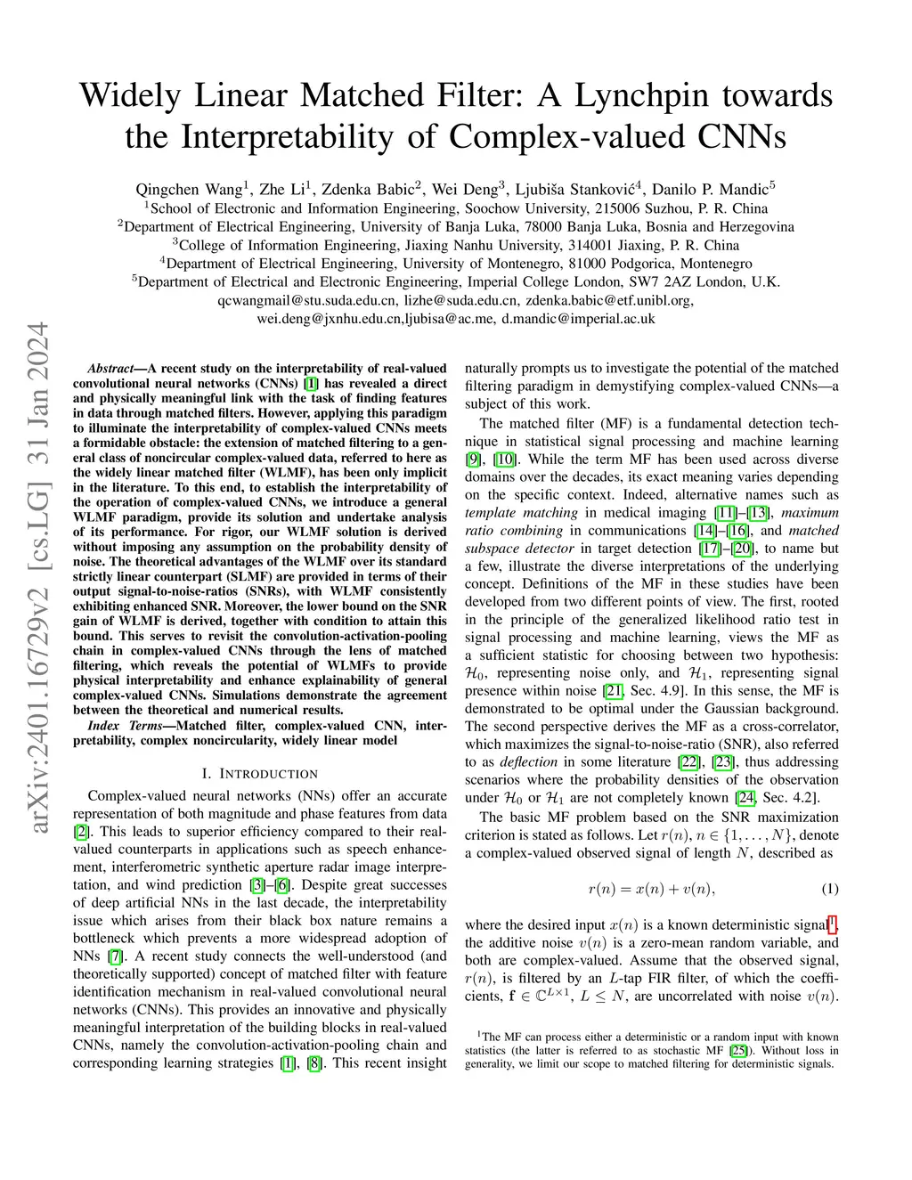A recent study on the interpretability of real-valued convolutional neural networks (CNNs) {Stankovic_Mandic_2023CNN} has revealed a direct and physically meaningful link with the task of finding features in data through matched filters. However, applying this paradigm to illuminate the interpretability of complex-valued CNNs meets a formidable obstacle: the extension of matched filtering to a general class of noncircular complex-valued data, referred to here as the widely linear matched filter (WLMF), has been only implicit in the literature. To this end, to establish the interpretability of the operation of complex-valued CNNs, we introduce a general WLMF paradigm, provide its solution and undertake analysis of its performance. For rigor, our WLMF solution is derived without imposing any assumption on the probability density of noise. The theoretical advantages of the WLMF over its standard strictly linear counterpart (SLMF) are provided in terms of their output signal-to-noise-ratios (SNRs), with WLMF consistently exhibiting enhanced SNR. Moreover, the lower bound on the SNR gain of WLMF is derived, together with condition to attain this bound. This serves to revisit the convolution-activation-pooling chain in complex-valued CNNs through the lens of matched filtering, which reveals the potential of WLMFs to provide physical interpretability and enhance explainability of general complex-valued CNNs. Simulations demonstrate the agreement between the theoretical and numerical results.