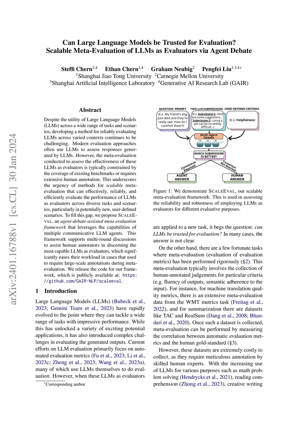 Despite the utility of Large Language Models (LLMs) across a wide range of tasks and scenarios, developing a method for reliably evaluating LLMs across varied contexts continues to be challenging. Modern evaluation approaches often use LLMs to assess responses generated by LLMs. However, the meta-evaluation conducted to assess the effectiveness of these LLMs as evaluators is typically constrained by the coverage of existing benchmarks or requires extensive human annotation. This underscores the urgency of methods for scalable meta-evaluation that can effectively, reliably, and efficiently evaluate the performance of LLMs as evaluators across diverse tasks and scenarios, particularly in potentially new, user-defined scenarios. To fill this gap, we propose ScaleEval, an agent-debate-assisted meta-evaluation framework that leverages the capabilities of multiple communicative LLM agents. This framework supports multi-round discussions to assist human annotators in discerning the most capable LLMs as evaluators, which significantly eases their workload in cases that used to require large-scale annotations during meta-evaluation. We release the code for our framework, which is publicly available at: \url{https://github.com/GAIR-NLP/scaleeval}.