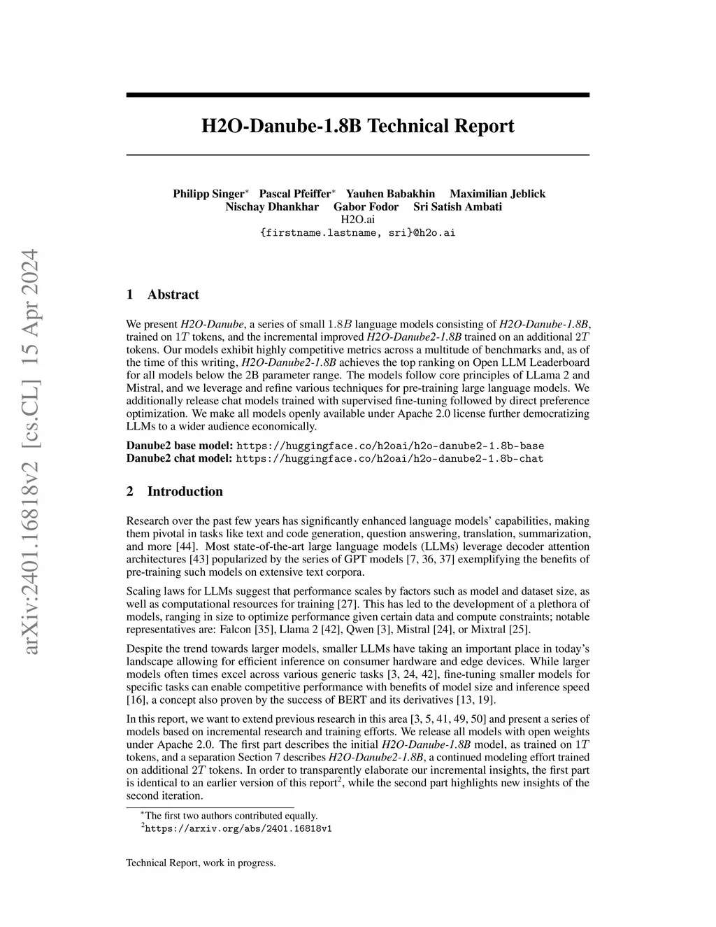 We present H2O-Danube, a series of small 1.8B language models consisting of H2O-Danube-1.8B, trained on 1T tokens, and the incremental improved H2O-Danube2-1.8B trained on an additional 2T tokens. Our models exhibit highly competitive metrics across a multitude of benchmarks and, as of the time of this writing, H2O-Danube2-1.8B achieves the top ranking on Open LLM Leaderboard for all models below the 2B parameter range. The models follow core principles of LLama 2 and Mistral, and we leverage and refine various techniques for pre-training large language models. We additionally release chat models trained with supervised fine-tuning followed by direct preference optimization. We make all models openly available under Apache 2.0 license further democratizing LLMs to a wider audience economically.